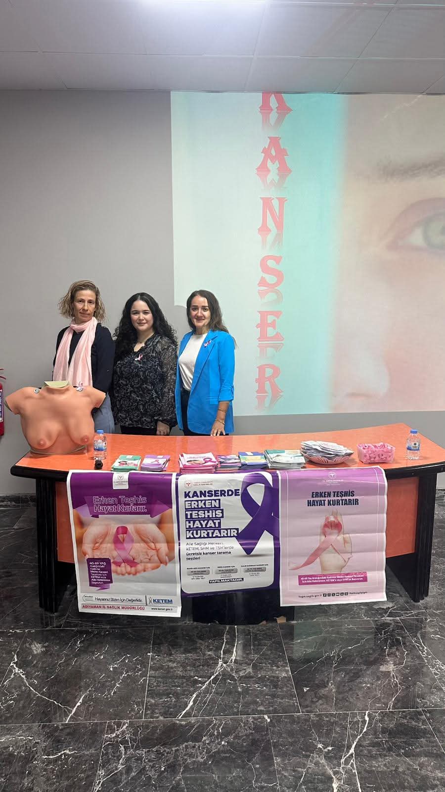 Eğitim hemşireleri Aysun Aydın Can ve Serap Çelik Sönmez tarafından sinevizyon destekli sunumların ardından, model meme üzerinde kendi kendine muayenenin nasıl yapılacağı uygulamalı olarak gösterildi.