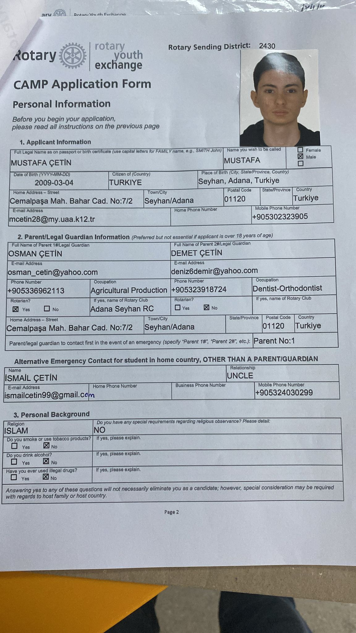 Adana Seyhan Rotary Kulübü Gençlik Değişim Kısa Dönem Programına aday göstermiştir.