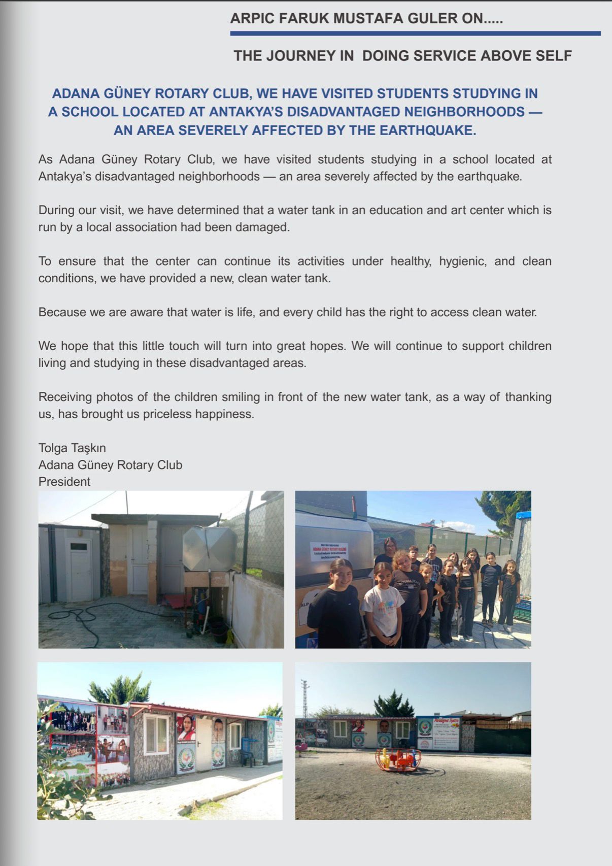 Adana Güney Rotary Kulübü olarak Antakya ziyaretimiz sırasında, depremzede öğrencilerin eğitim aldığı Defne Gönüllüleri Derneği’nin Subaşı Mahallesi’ndeki Eğitim ve Sanat Merkezini ziyaret ettik. Merkezde çocuklar ve gençler; tiyatro, yaratıcı drama, koro, müzik ve İngilizce gibi alanlarda büyük bir özveriyle çalışıyorlar. Ziyaretimizde, daha önce zarar görmüş bir plastik su deposu olduğunu tespit ettik ve merkezin sağlıklı ve hijyenik koşullarda çalışmalarına devam edebilmesi için yeni bir galvanizli temiz su deposu yaptırdık. Depo hem gençlerin eğitim aldığı kurs merkezi tarafından kullanılmakta hem de mahalle sakinleri temiz suya erişim için kullanmakta olduğunu öğrendik. Eğitimin ve sanatın hayat bulduğu bu merkezde, çocuklarımızın ve gençlerimizin geleceğine küçük ama anlamlı bir dokunuş yapabilmiş olmaktan mutluyuz.