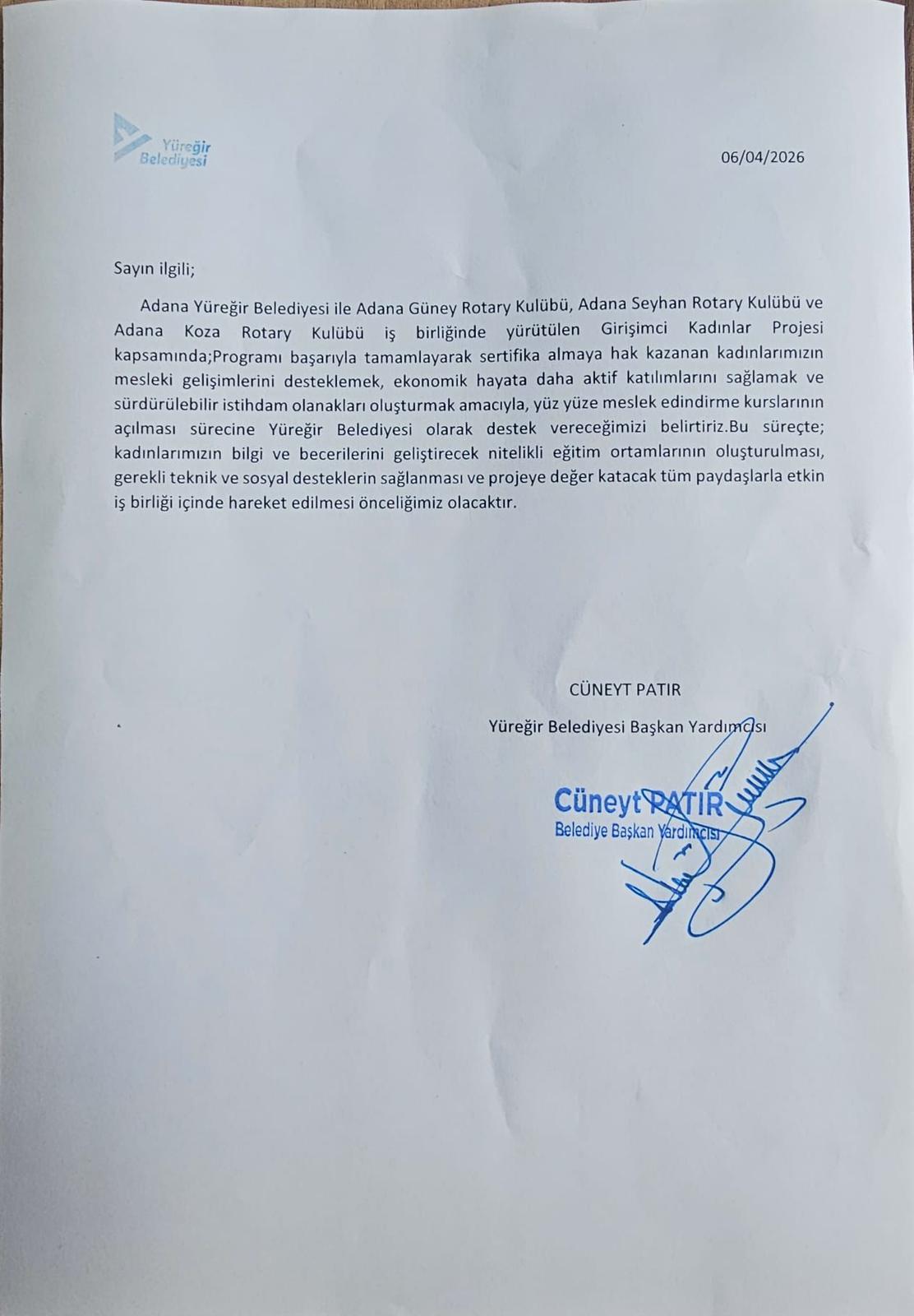 Adana Seyhan , Güney ve Koza Rotary kulüpleri olarak Yüreğir Belediyesi işbirliğiyle nisan mayıs ve haziran aylarında sertifika alan kadınlarımıza meslek edindirme kursu düzenleyeceğiz. Destek veren herkese teşekkür ediyoruz. İyilik için birleşmeye devam ediyoruz.