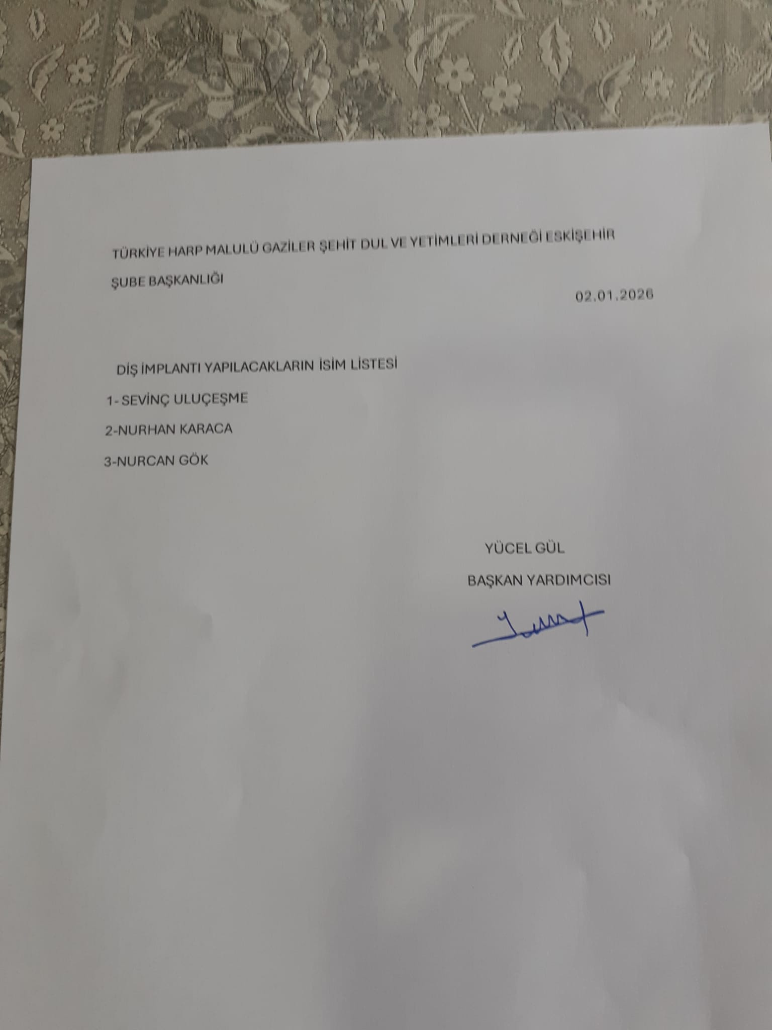 Toplum Hizmetleri 5. Madde kapsamında Şehit ve Gazilerin ailelerine yönelik implant tedavisi için , Türkiye Harp Malülü Gazi ve Şehit Dul ve Yetimler Derneği Eskişehir Şb.den istediğimiz isimlerden , Diş Hekimi üyemiz Volkan Demir ‘in gelen hastaları muayenesi sonucu implant a uygun kişiler belirlenmiştir. Diş Hekimi üyemiz “ bu aileler için ne yapsak azdır” diyerek, bölgeden gelecek implant malzemeleri dışında üst kaplamaları kendisi üstlenmiştir. Araya giren Ramazan dan sonra tedavilere başkanacak ve tamamlanacaktır. Gelen ve görüşülen hastalar listesi ilişiktedir. Dernek Bşk Yard Yücel Gül +90 (537) 221 06 40. Diş Hekimi Volkan Demir 0 (533) 122 28 48.
