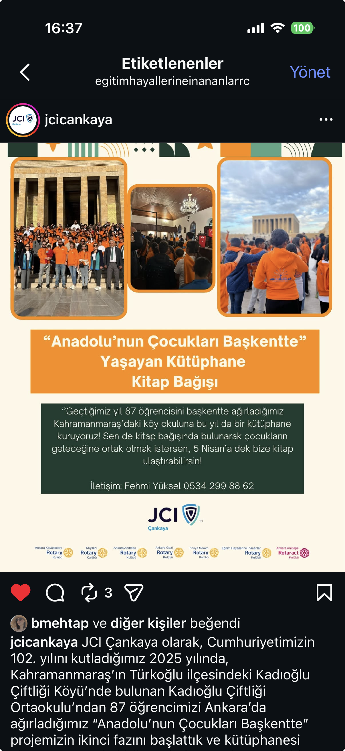 3 Mart 2026 tarihinde düzenlenen JCI Çankaya tarafından düzenlenen akşam yemeğinde tarafımıza teşekkür yazıları verilmiştir. Aynı akşam projenin devamı olarak, aynı okulda kurulması planlanan kütüphane için ilgili STK ve kulüplerle iş birliği içerisinde çalışmalar sürdürülmesine karar verilmiştir.