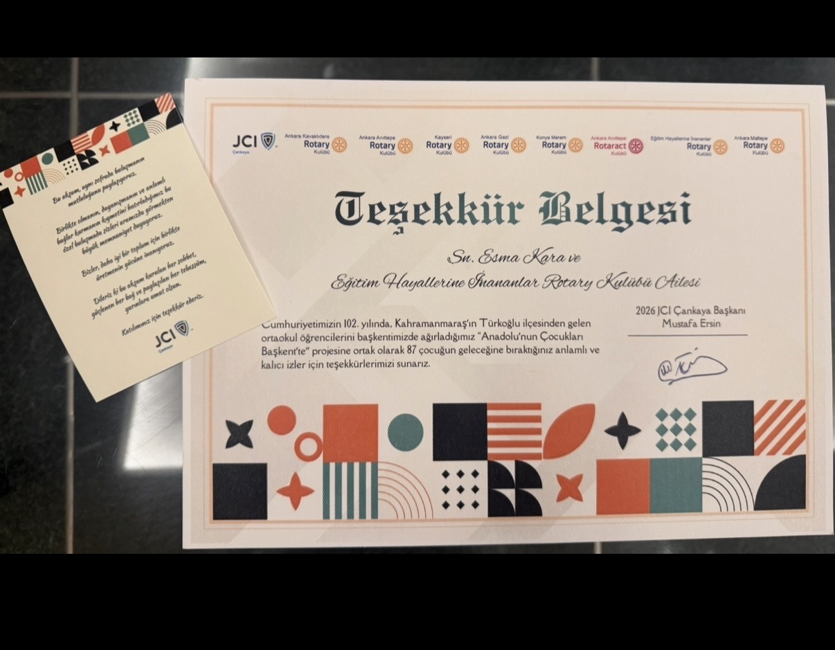 JCI Çankaya önderliğinde; Ankara Kavaklıdere RK, Kayseri RK, Ankara Anıttepe RK, Ankara Gazi RK, Konya Meram RK ve Ankara Anıttepe Rotaract iş birliğiyle, Kahramanmaraş Kadıoğlu Çiftliği Ortaokulu’ndan 81 öğrenci 18 Ekim 2025 Tarihinde Ankara’da ağırlanmıştır.