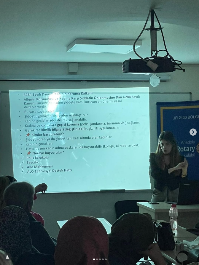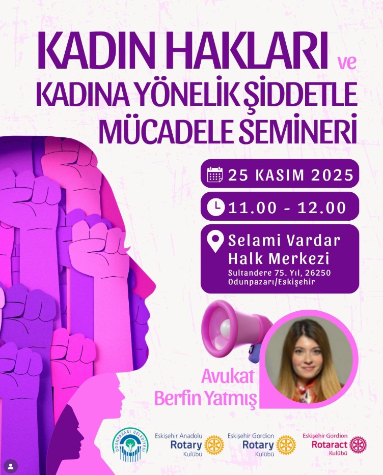 Eskişehir Gordion Rotary , Eskişehir Anadolu Rotary, Eskişehir Gordion Rotaract Kulübü olarak, 25 Kasım Kadına Yönelik Şiddete Karşı Uluslararası Mücadele Günü kapsamında, Odunpazarı Belediyesi’nin öncülüğünde kadın haklarına dikkat çekmek ve toplumsal farkındalığı artırmak amacıyla Odunpazarı Selami Vardar Halk Merkezi’nde bir seminer düzenledik. Etkinliğimizde; kadına yönelik şiddetin türleri, hukuki haklar, başvuru mekanizmaları ve toplumsal bilinç oluşturmanın yolları üzerine önemli bilgiler paylaşıldı. Rotaryen üyemiz avukat Berfin Yatmış, kadınların şiddet karşısında yalnız olmadığını, haklarını bilmenin ve destek mekanizmalarına ulaşmanın hayati önem taşıdığını vurguladı. Bu anlamlı günde; • Şiddetin her türüne karşı durduğumuzu, • Kadınların güçlenmesi için çalışmalarımızı sürdüreceğimizi, • Toplumun tüm kesimlerini farkındalık oluşturmaya davet ettiğimizi bir kez daha ifade ediyoruz. Kadına yönelik şiddetin olmadığı bir dünya mümkün… Birlikte daha güçlü, daha eşit bir gelecek için çalışmaya devam edeceğiz.