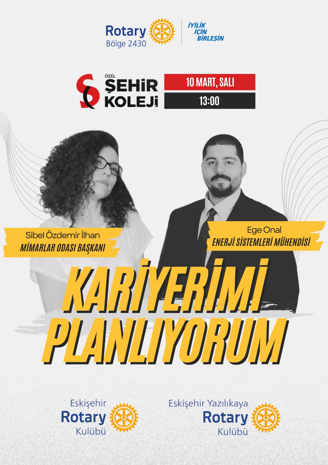 Eskişehir Rotary Kulübü ve Eskişehir Yazılıkaya Rotary Kulübü olarak ortaklaşa düzenlediğimiz etkinlikte; Eskişehir Şehir Koleji lise son sınıf öğrencilerini, Eskişehir Mimarlar Odası Başkanı Sibel Özdemir İlhan ve Enerji Sistemleri Mühendisi Ege Onal ile bir araya getirdik. Soru-cevap formatında gerçekleştirilen buluşmada konuklarımız; öğrencilerin meslek seçimi, eğitim süreçleri ve kariyer hedeflerine dair merak ettikleri soruları yanıtladılar.