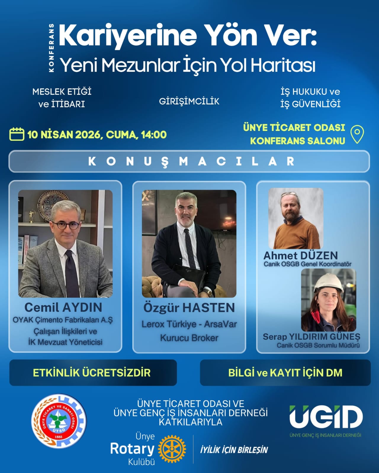 10 Nisan 2026 Cuma günü gerçekleştirilecek olan etkinlikte meslek etiği ve itibarı ile ilgili olarak OYAK Çimento Fabrikaları A.Ş. - Çalışan İlişkileri ve İnsan Kaynakları Mevzuat Yöneticisi Cemil Aydın ile "Meslek Etiği ve İtibarı" ile ilgili olarak bir söyleşi gerçekleştirilecektir. Etkinliğe yoğunluklu olarak Ünye İktisadi ve İdari Bilimler Fakültesi'nden öğrenci kulüpleri üyeleri olan son sınıf öğrencileri katılacaktır. Minimum 75 kişinin katılacağı bir organizasyon olacağı öngörülmektedir