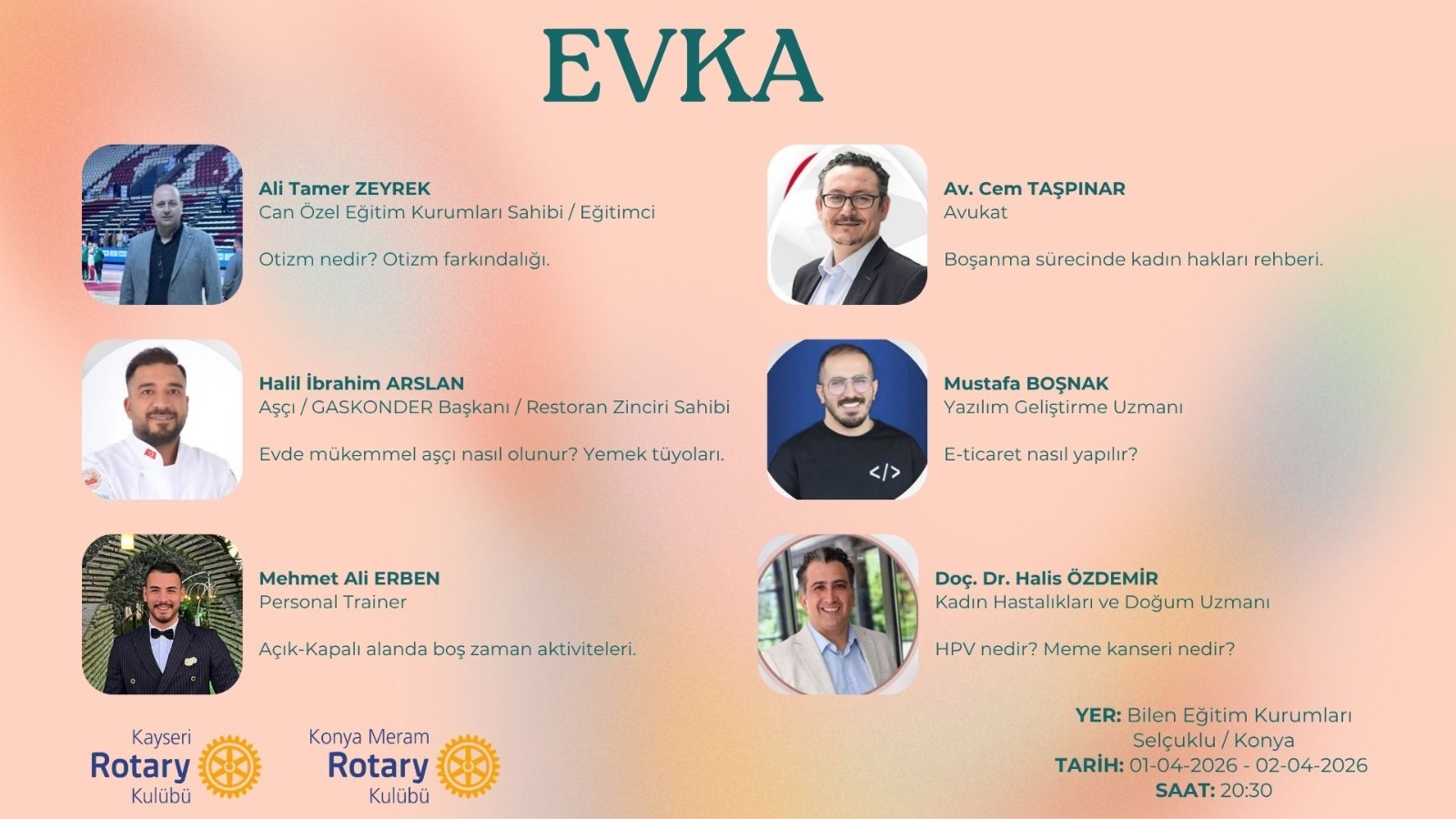 Konya Meram Rotary Kulübü ve Kayseri Rotary Kulübü iş birliği ile hayata geçirilen EVKA projesi, 01-02 Nisan 2026 tarihlerinde Konya Selçuklu’da bulunan Bilen Eğitim Kurumları ev sahipliğinde gerçekleştirilmiştir. Proje, toplumun farklı kesimlerine yönelik farkındalık oluşturmak, bireylerin yaşam kalitesini artırmak ve çok yönlü gelişimlerine katkı sağlamak amacıyla planlanmıştır.