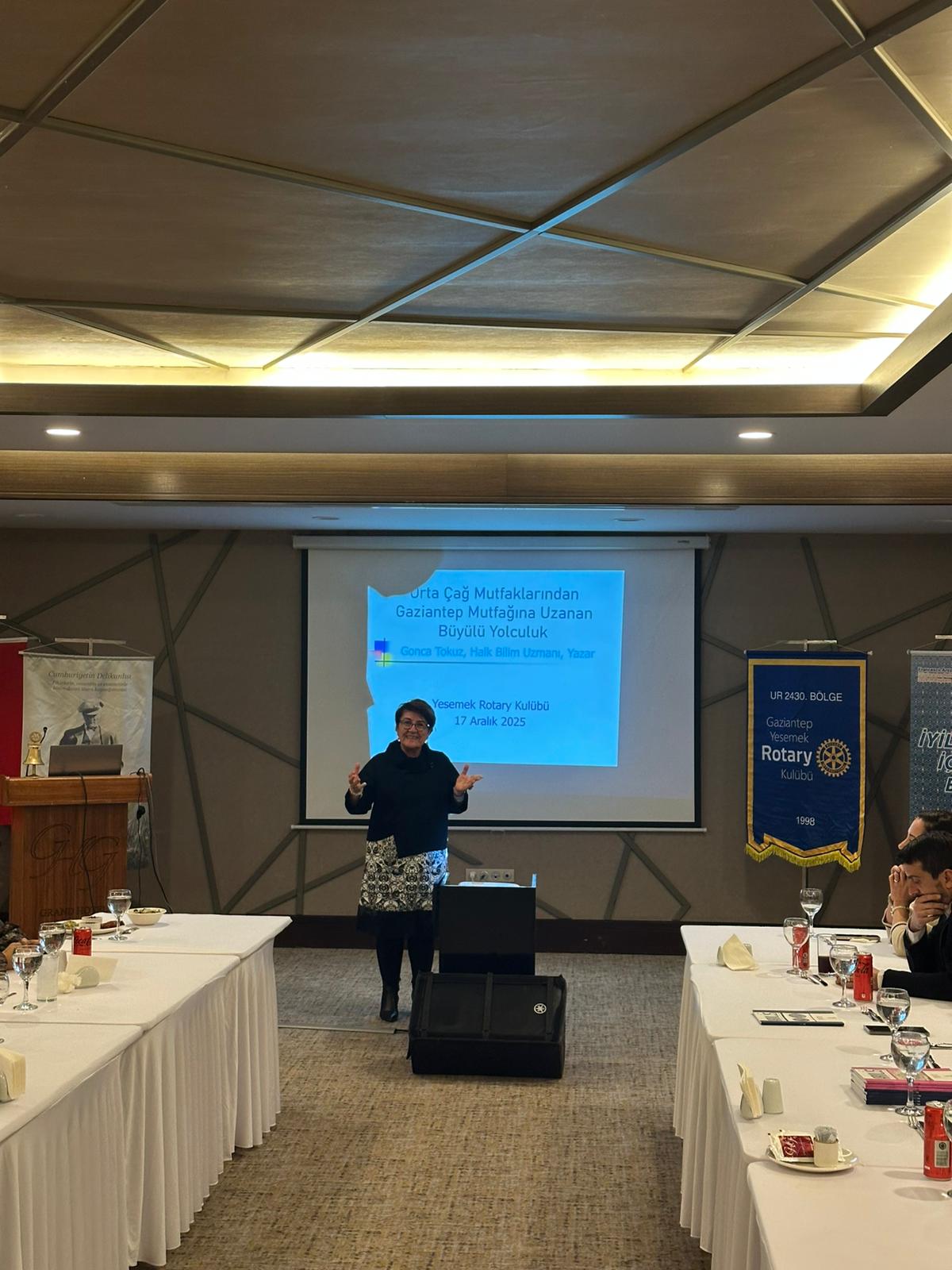 17 Aralık Çarşamba günü ise Rotary 2440. Bölgeden Toprak Ana Rotary Kulübü üyesi Halkbilim uzmanı,yazar Sn. Gonca Tokuz 'u ’“Ortaçağ Mutfaklarından Gaziantep Mutfağı’na Uzanan Büyülü Yolculuk” konulu sunumuyla ağırladık.