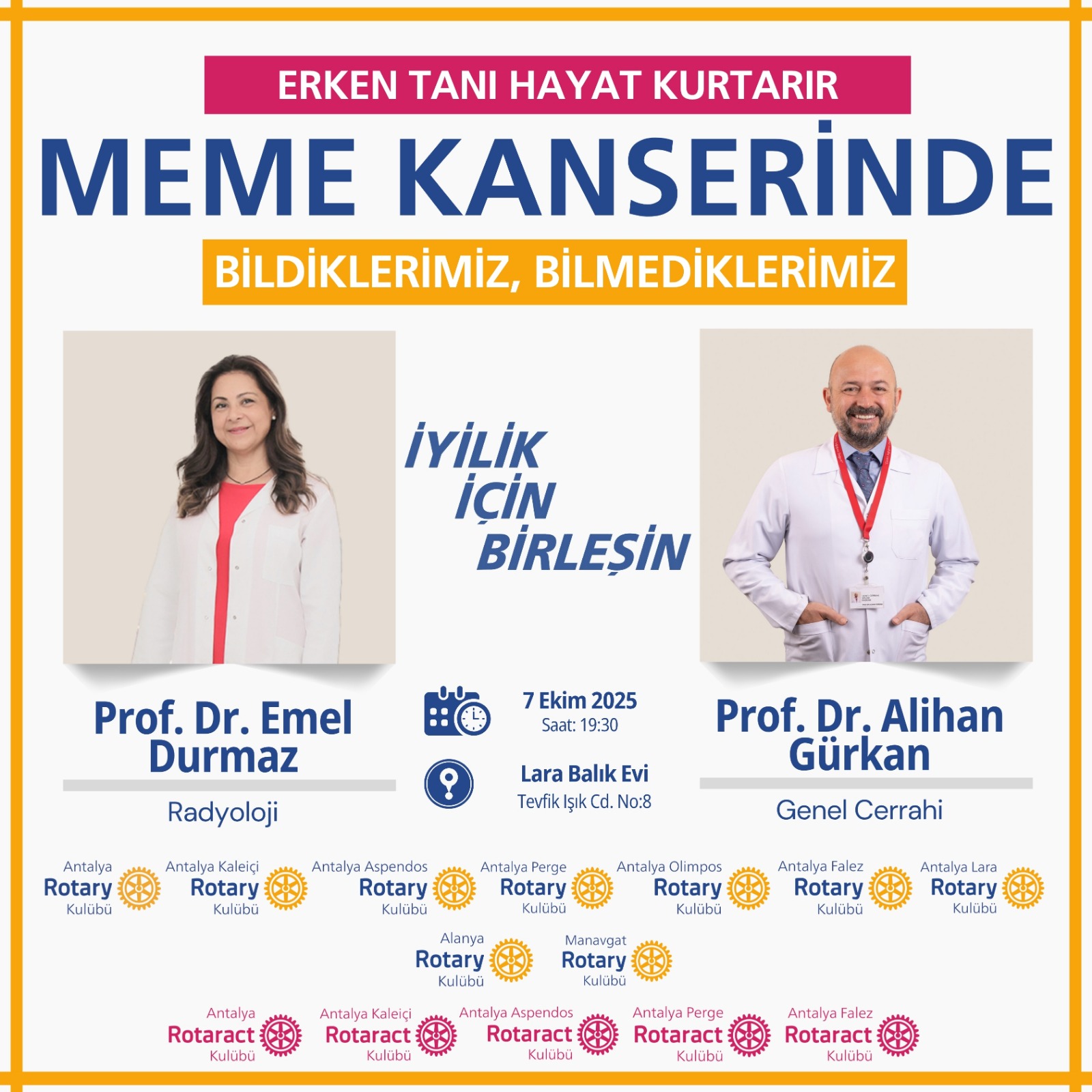 Antalya Rotary Kulüpleri (9 kulüp) ve Rotaract Klüplerimiz (5 Kulüp) ile birlikte ortak olarak 07.10.2025 tarihinde Antalya Lara Balık Evinde “Meme Kanseri” ve Erken Tanı konulu İntercity toplantısı düzenledik. Yaklaşık 140 rotaryen, rotaract ve roteşimizin katıldığı toplantıda Prof.Dr. Emel DURMAZ ve Prof.Dr. Alihan GÜRKAN tarafından paylaşılan değerli bilgiler ile meme kanseri ve korunması yönünde önemli bilgilere sahip olurken, yapılan etkinlik ile “iyilik için birleşerek” farkındalık yaratmaya çalıştık.