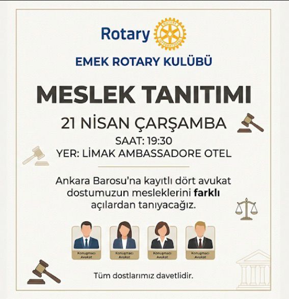21 NİSAN ÇARŞAMBA AKŞAMI KULÜP ÜYESİ 4 AVUKAT DOSTUMUZ KENDİ MESLEK ALANLARINDA MESLEKLERİNİ FARKLI AÇILARDAN TANITIRKEN MESLEK ETİĞİ KONUSUNDA OTURUM YAPILACAKTIR.