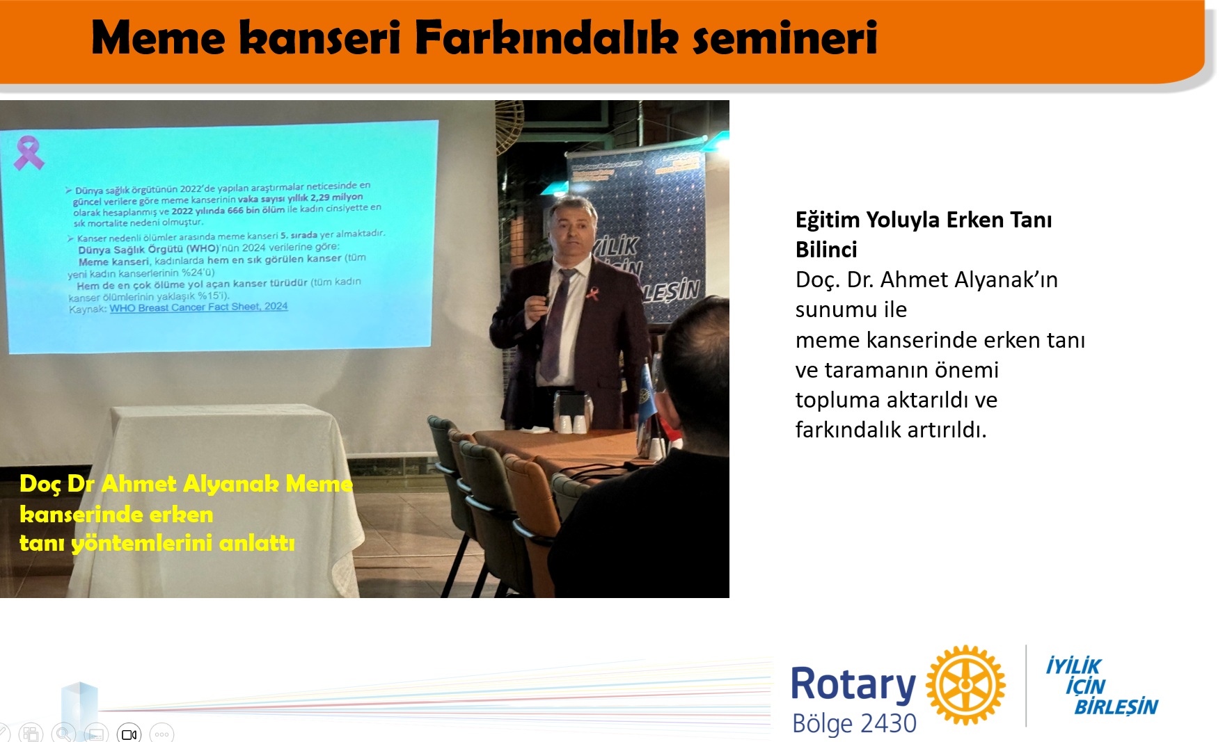 Eğitim Yoluyla Erken Tanı Bilinci Doç. Dr. Ahmet Alyanak’ın sunumu ile meme kanserinde erken tanı ve taramanın önemi topluma aktarıldı ve farkındalık yaratıldı.