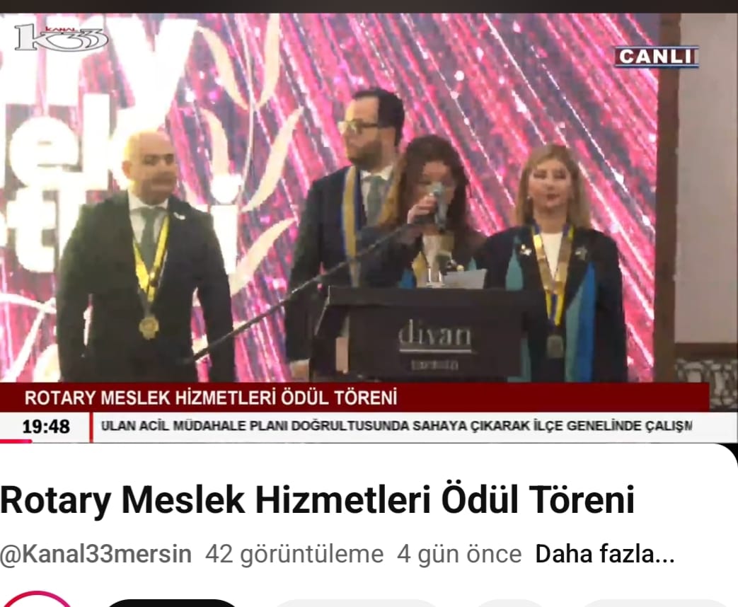 Mersin Kızkalesi Rotary Kulübü, Toros Rotary Kulübü, Akdeniz Rotary Kulübü ve Mersin Olba Rotary Kulübü olarak 18 Şubat 2026 tarihinde DİVAN Otel'de düzenlediğimiz Meslek Hizmetleri Ödül Töreni 'nde 4 ana kategoride de toplam 8 tane ödül verildi. Kentimize değer katan,meslek etiğini,dürüstlüğü ilke edinmiş ,çalışmalarıyla ilham veren,kamu yönetimi,akademi,spor,sanat ve iş dünyasından başarıları ile öne çıkan değerli isimleri ödüllendirdiğimiz törenimiz, Mersin'in en eski yerel tv kanallarından KANAL 33 tarafından canlı olarak yayınlanmıştır.Kayıt you tubede yayındadır.