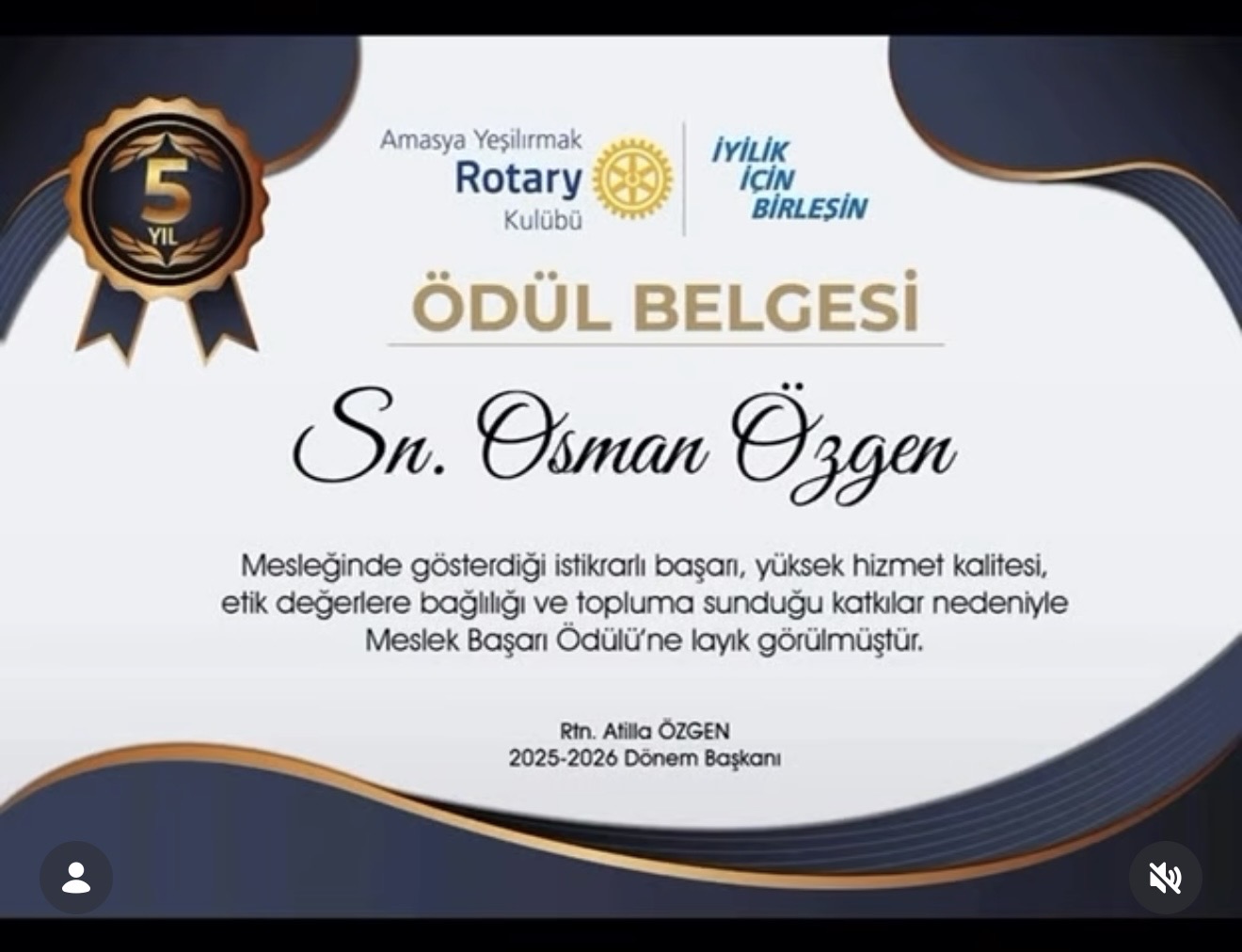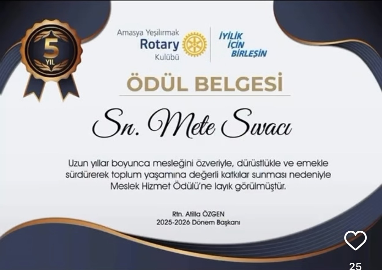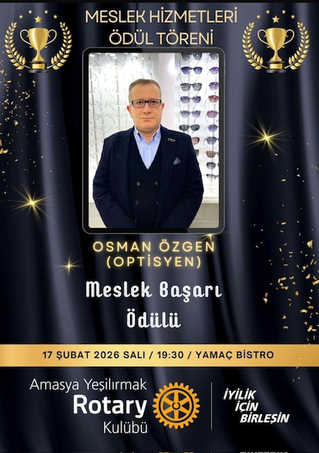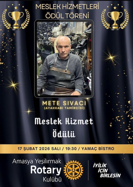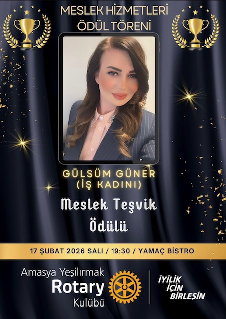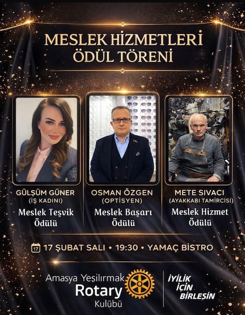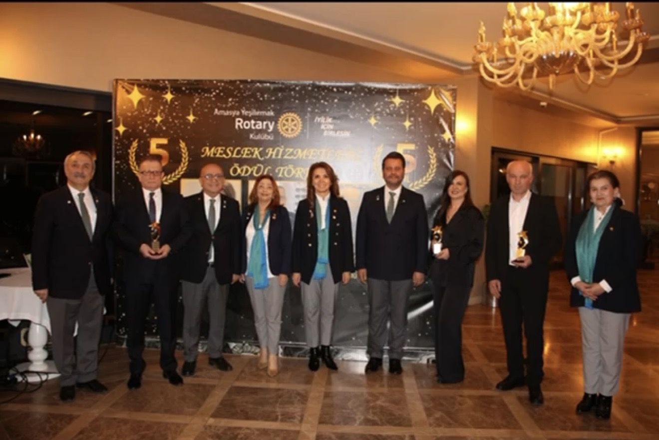 Amasya Yeşilırmak Rotary Kulübü 2025-2026 Dönemi Meslek Hizmetleri Ödül töreni seçkin davetlilerin ve rOtaryen üyelerimizin katılımı ile gerçekleştirildi.Törene Amasya Belediye Başkanı Sayın Av.Turgay Sevindi,2430 Bölge Meslek Hizmetlerinden Sorumlu Guvernör Yardımcısı Rtn.Nur Aydıner,2430 Bölge 11.Grup Kulüplerden sorumlu Guvernör Yard.Fahrettin Çakırsoy&Nükhet katıldı. Toplum yaşamına değer katan ,mesleklerinde etik değerler ve başarıları ile örnek olan isimlerin onurlandırıldığı törende,uzun yıllar boyunca mesleğiniri,dürüstlük ve emekle sürdüren Mete Sıvacı Meslek Hizmet Ödülü'ne; mesleğinde gösterdiği istikrarlı başarı,yüksek hizmet kalitesi ve topluma sunduğu katkılar nedeniyle Osman Özgen Meslek Başarı Ödülü'ne, topluma ilham veren çalışmaları ,üretkenliği ve özellikle gençlere örnek olan duruşu ile Gülsüm Güner Meslek Teşvik Ödülü'ne layık görüldü.