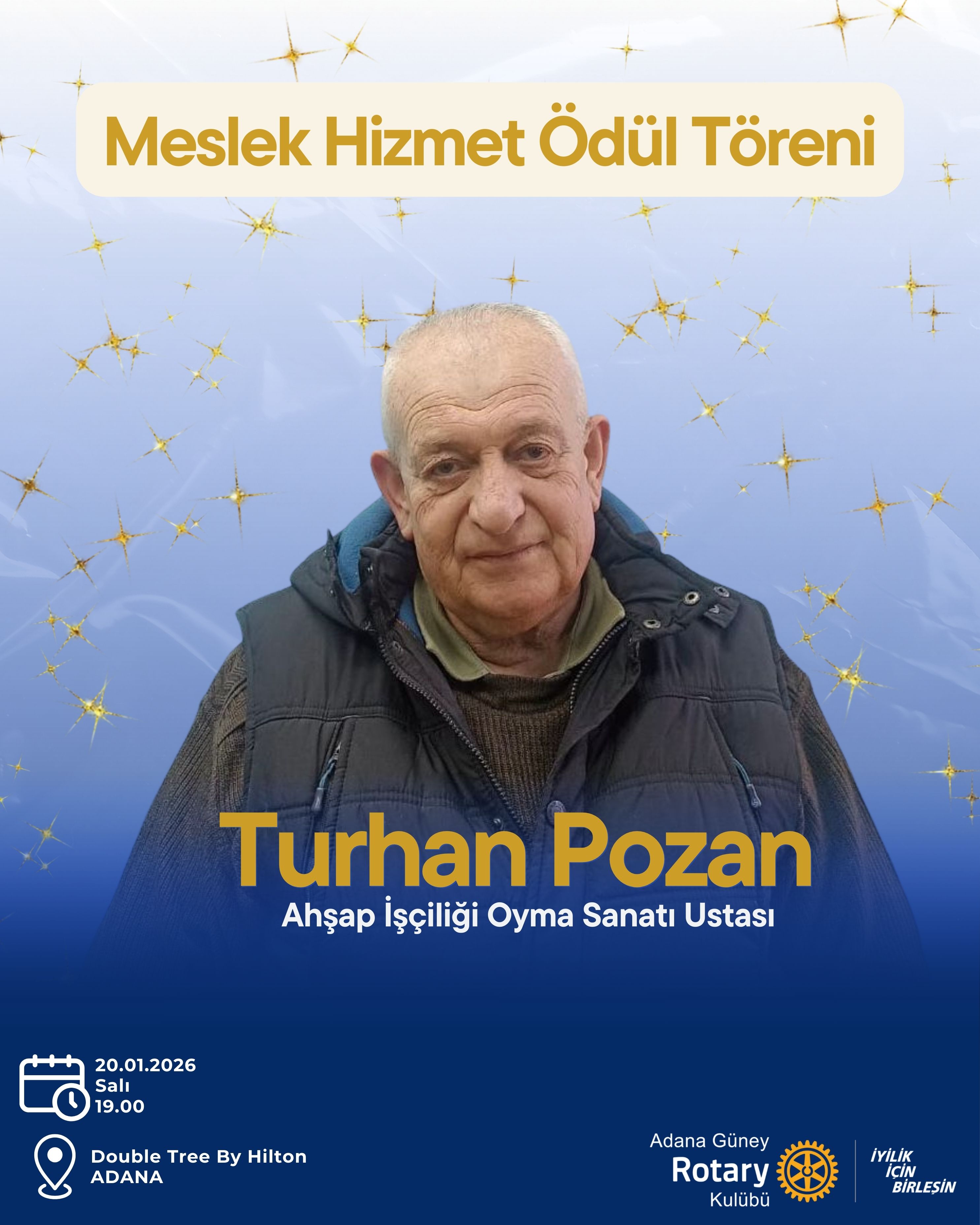 Adana Güney Rotary Kulübü olarak Kaybolmaya yüz tutmuş meslekler kategorisindeki ödülümüzü ahşap oyma sanatı ustası Turhan Pozan'a takdim ettik. Adana doğumlu ve Adana'ya hizmet etmiş bir mobilya ustası olarak 55 yıldır bu mesleği icra etmektedir.