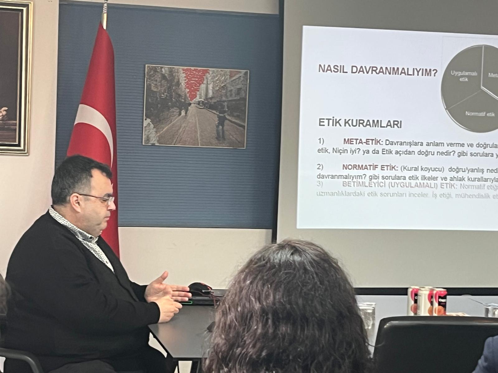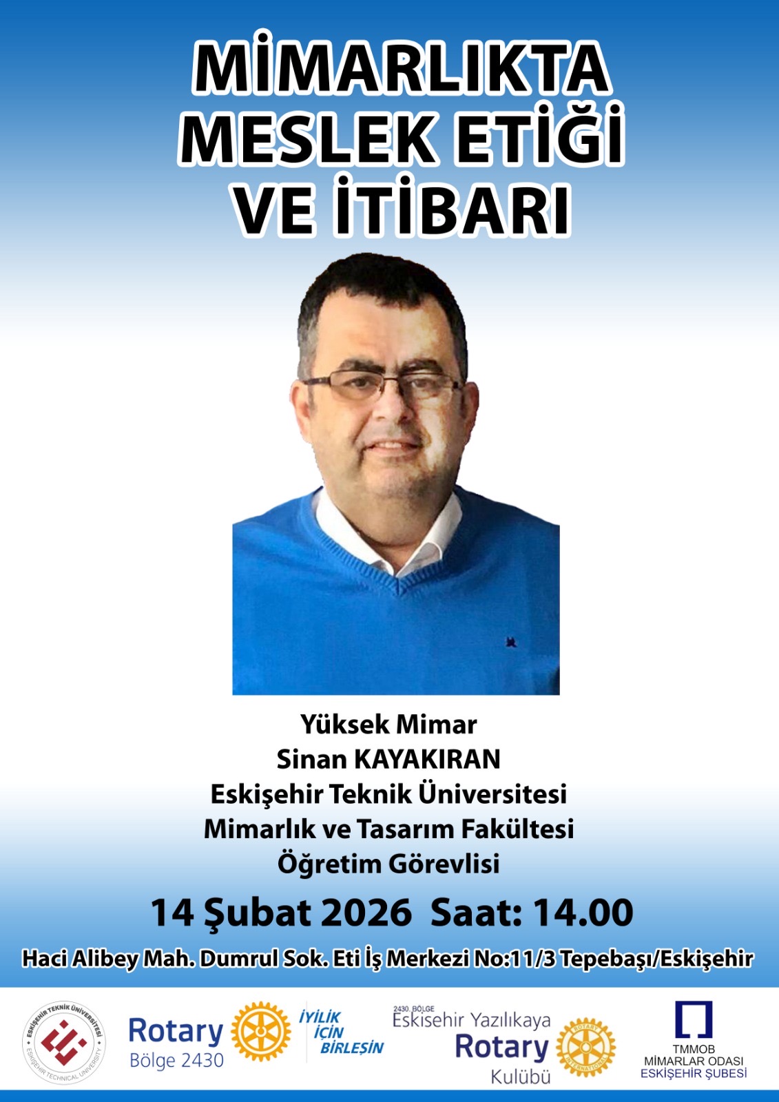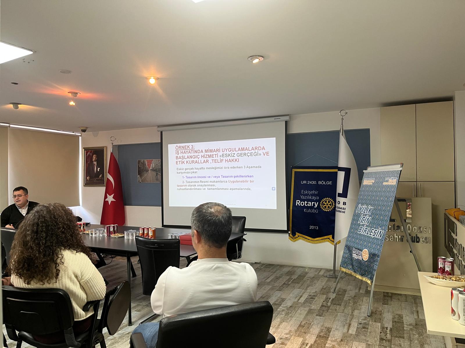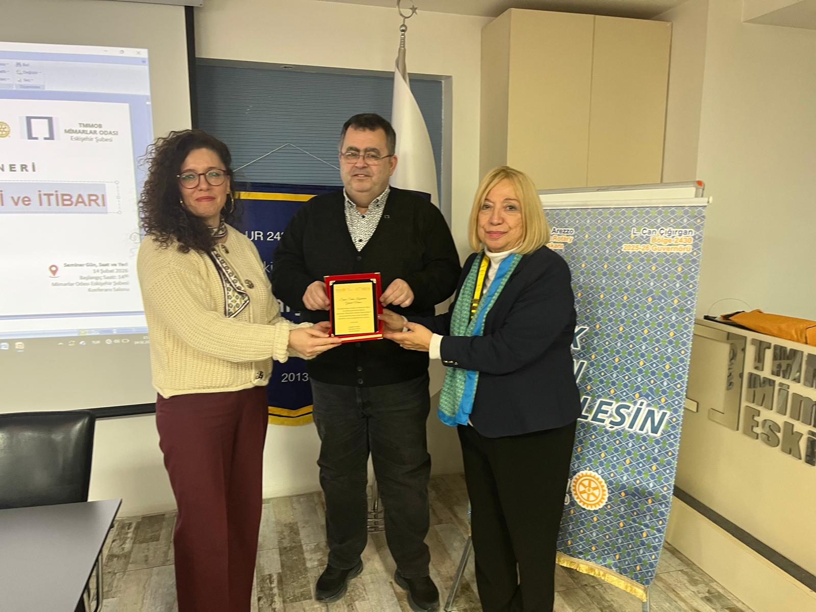 Meslek Hizmetleri Komitesi ikinci maddesi ,Meslek Etiği ve İtibarı Kapsamında Eskişehir Mimarlar Odası ile birlikte organize ettiğimiz , Eskişehir Mimarlar Odası Toplantı ve Seminer Salonunda yapılan .Mimarlıkta Meslek Etiği ve İtibarı konulu Eskişehir Teknik Üniversitesi Öğretim Görevlisi , Meslek Etiği Derslerine de giren Yüksek Mimar Sinan Kayakıran ‘ın sunduğu seminerimizi gerçekleştirdik.Eskişehir ‘li mimarların yoğun ilgi gösterdiği semşner sonrası Sinan Hocamız soruları cevapladı.Daha sonra Yüksek Mimar Sinan Kayakıran Hocamıza plaket takdim edildi.