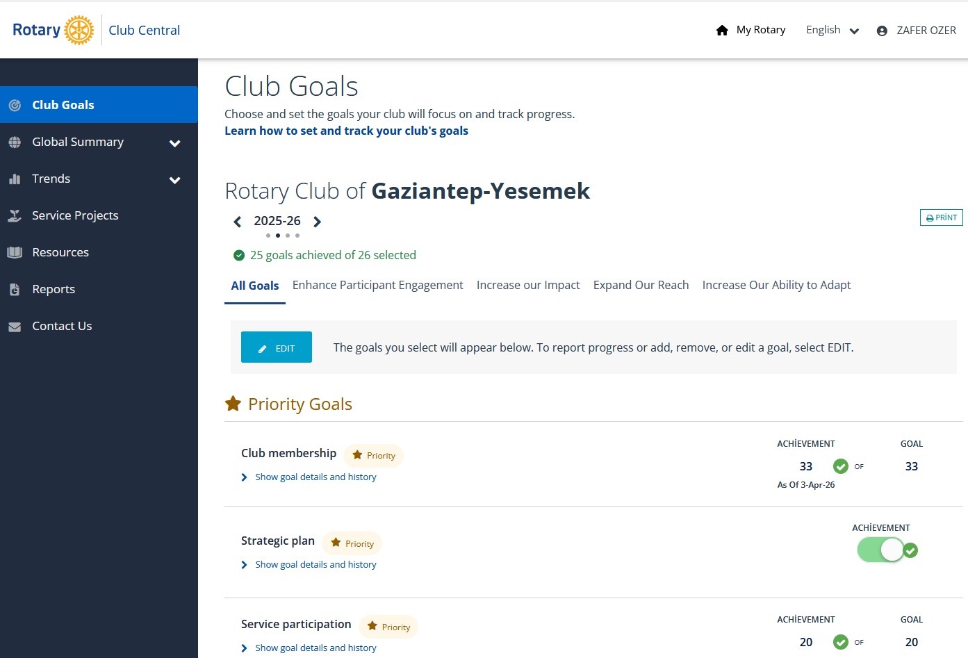 Zonguldak Rotary Kulübü'nün Kulüp Hedefleri 1 Temmuz 2025 tarihine kadar sisteme girişi tamamlanmıştır.
