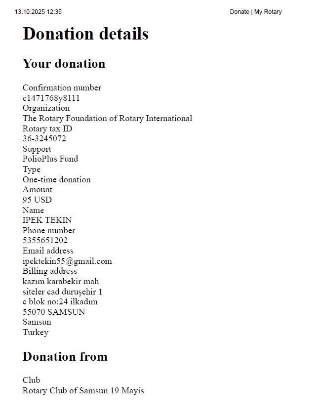 Geleneksel Go-Kart "Polio için yarışıyoruz" yarışımızdan elde ettiğimiz gelir ile Polio Plus Fonuna üye başı 5 USD toplam 95 USD bağış gerçekleştirdik.
