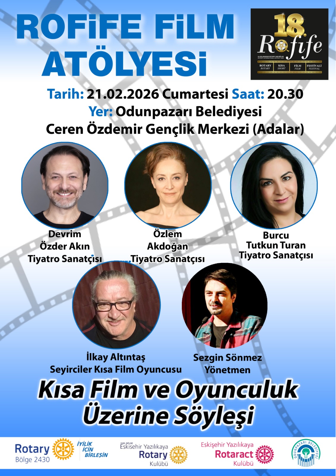 ROFİFE Film Atölyesi, sinema sanatına ilgi duyan katılımcıları alanında değerli isimlerle buluşturan, söyleşi ve seminer formatında gerçekleştirilen verimli bir sanat buluşması olarak düzenlenmiştir. Atölye kapsamında sinemanın anlatım dili, oyunculuk, senaryo ve yönetmenlik süreçlerine ilişkin bilgi paylaşımları yapılmış; katılımcılar, sanatçıların mesleki birikim ve bakış açılarını dinleme fırsatı bulmuştur. Değerli Dostların katılımıyla gerçekleşen programda, değerli sanatçılar Devrim Özder Akın, Özlem Akdoğan, Burcu Tutkun Turan, İlkay Altıntaş ve yönetmen Sezgin Sönmez bilgi ve deneyimlerini paylaşarak etkinliğe katkı sunmuştur. Samimi ve etkileşimli bir atmosferde gerçekleşen buluşma, katılımcılar açısından ilham verici ve ufuk açıcı bir içerikle tamamlanmıştır.