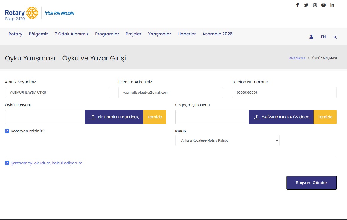 Kulübümüzün yapmış olduğu tanıtım faaliyetleri sonucunda Yağmur İlayda Utku Kulübümüz için Rotaöykü yarışmasına rotary 7 odak noktasını konu alan Bir Damla Umut öyküsü ile katılım sağlamıştır.