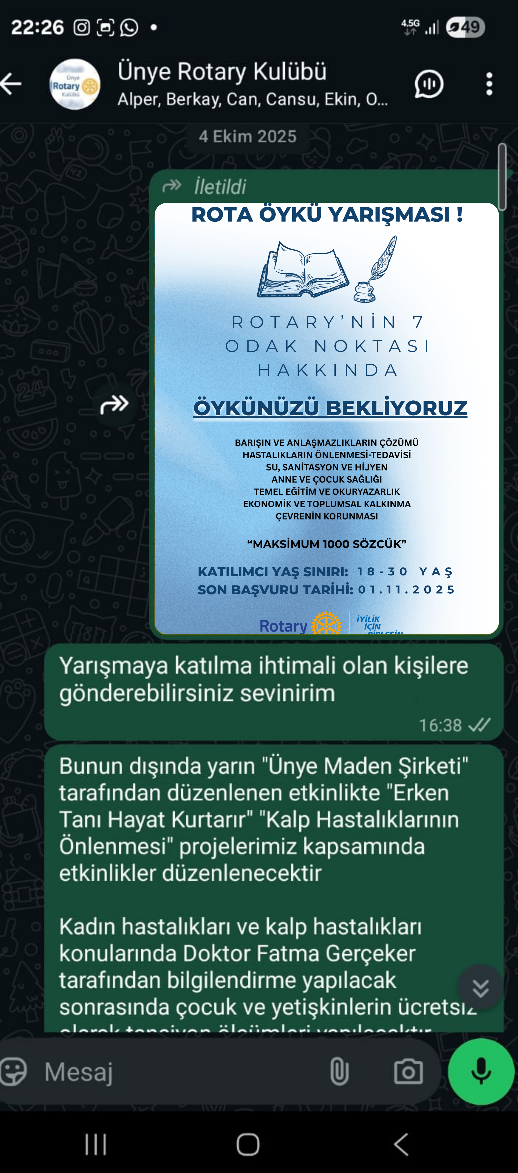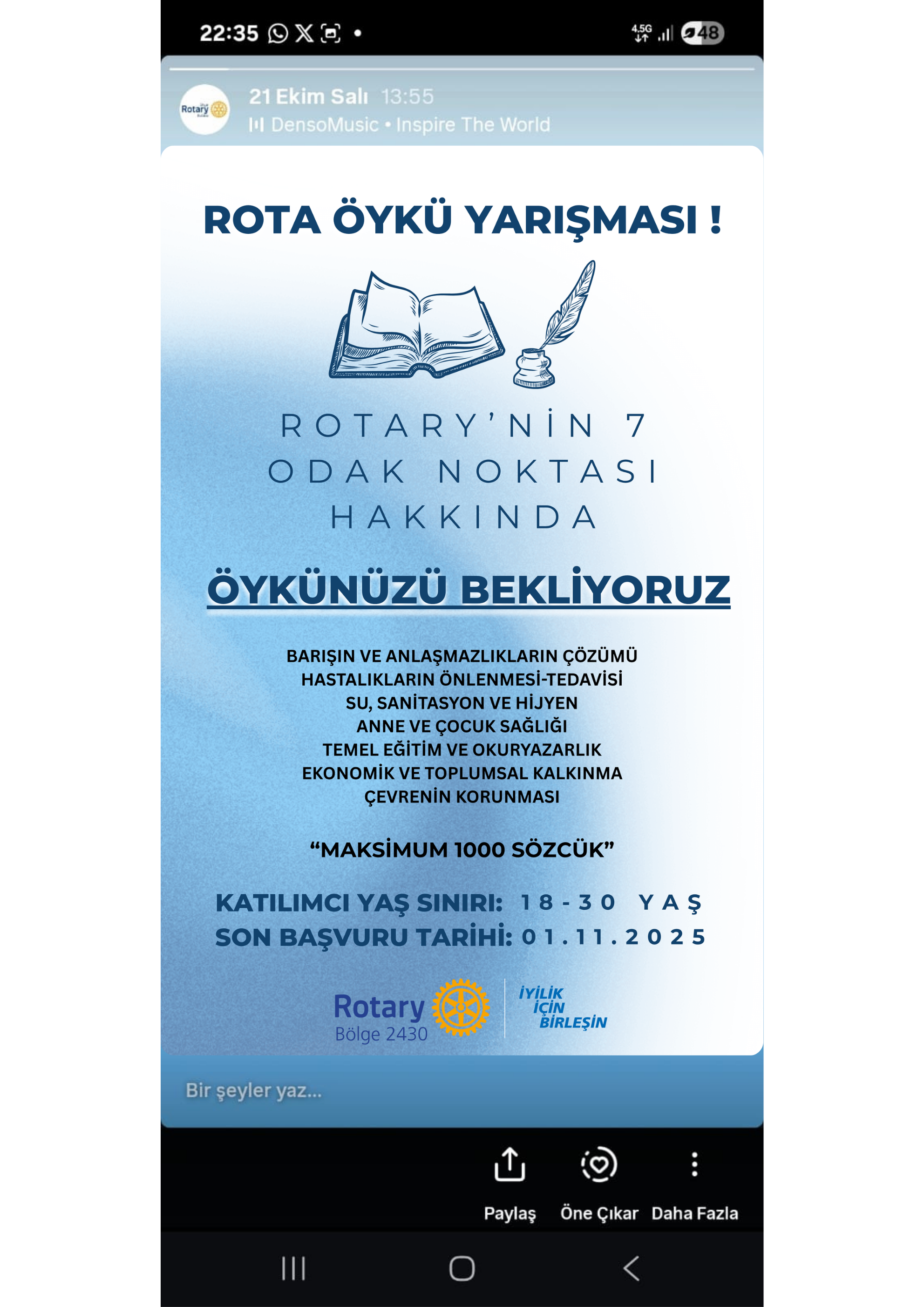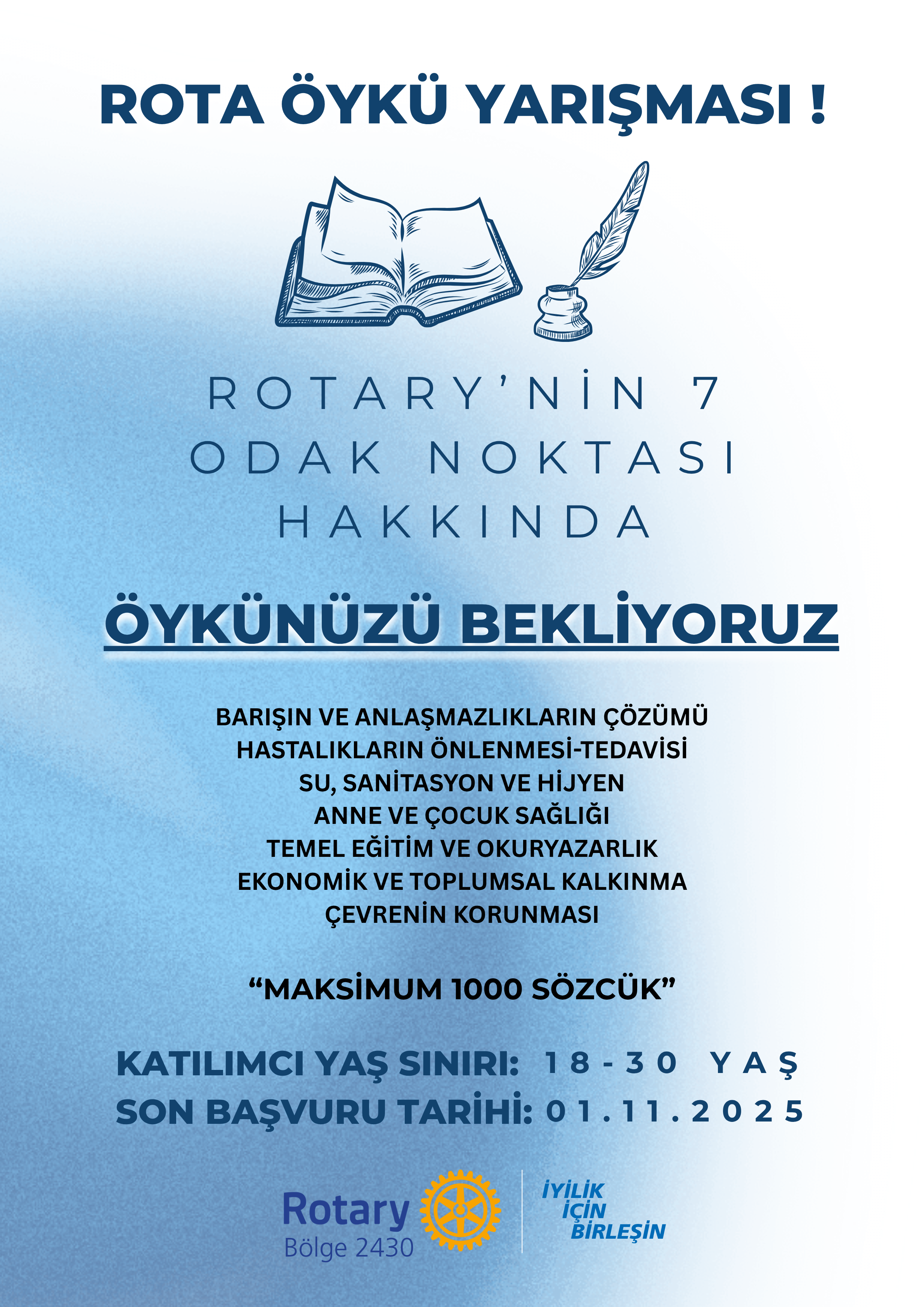 Rotary'nin 7 odak noktasını konu alan öykü yarışması ile ilgili komitenin uygun gördüğü şekilde tanıtım materyali yaratılması
