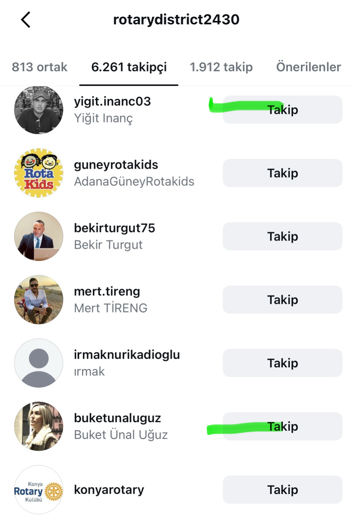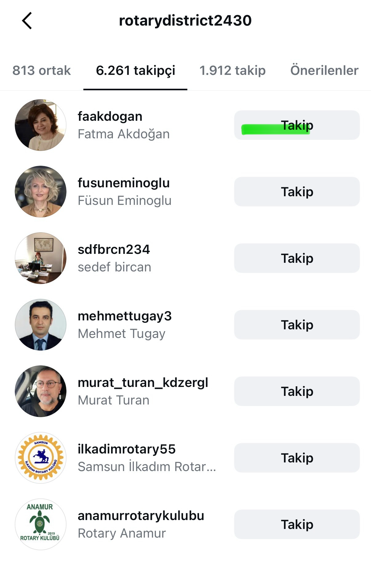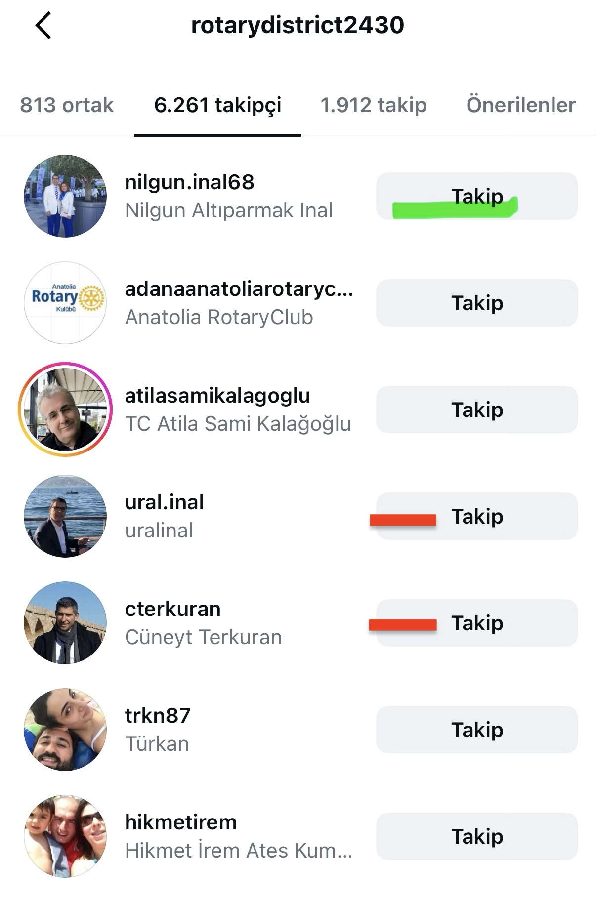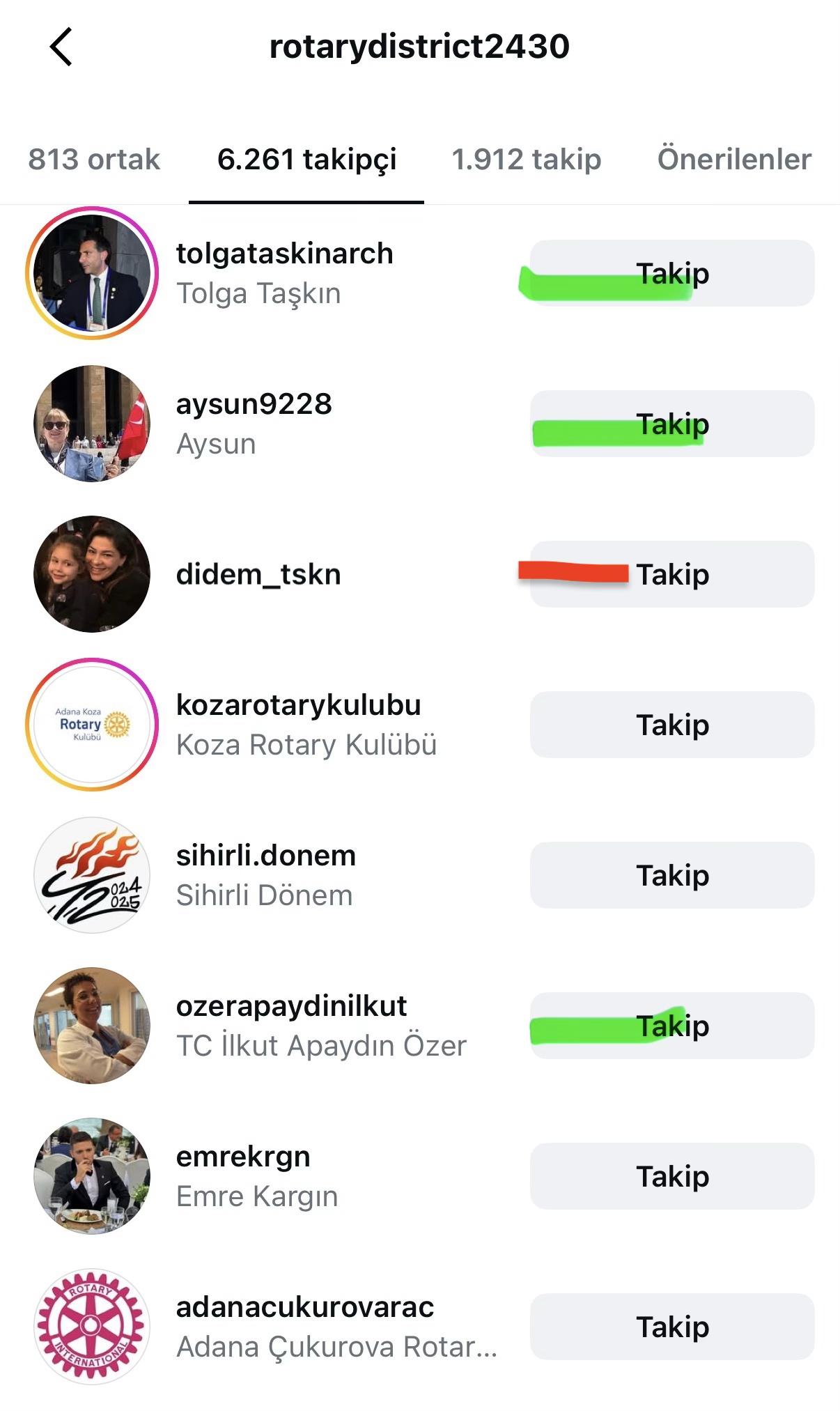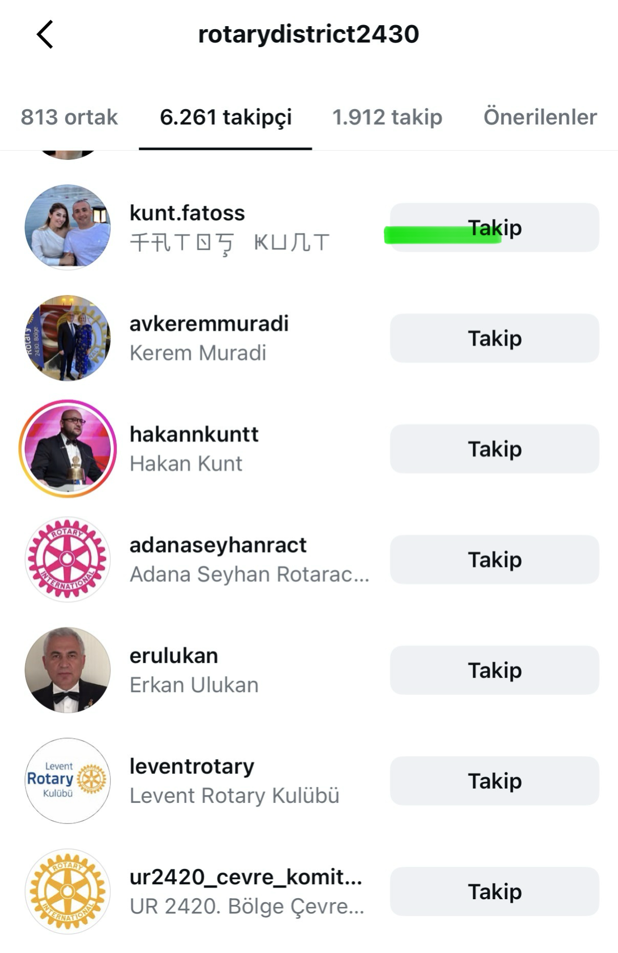 Adana Güney Rotary Kulübü Üye sayısı:59 Üye Takip Hesabı: 45 (yeşil işaretlidir) Eşler takip (kırmızı işaretlidir)