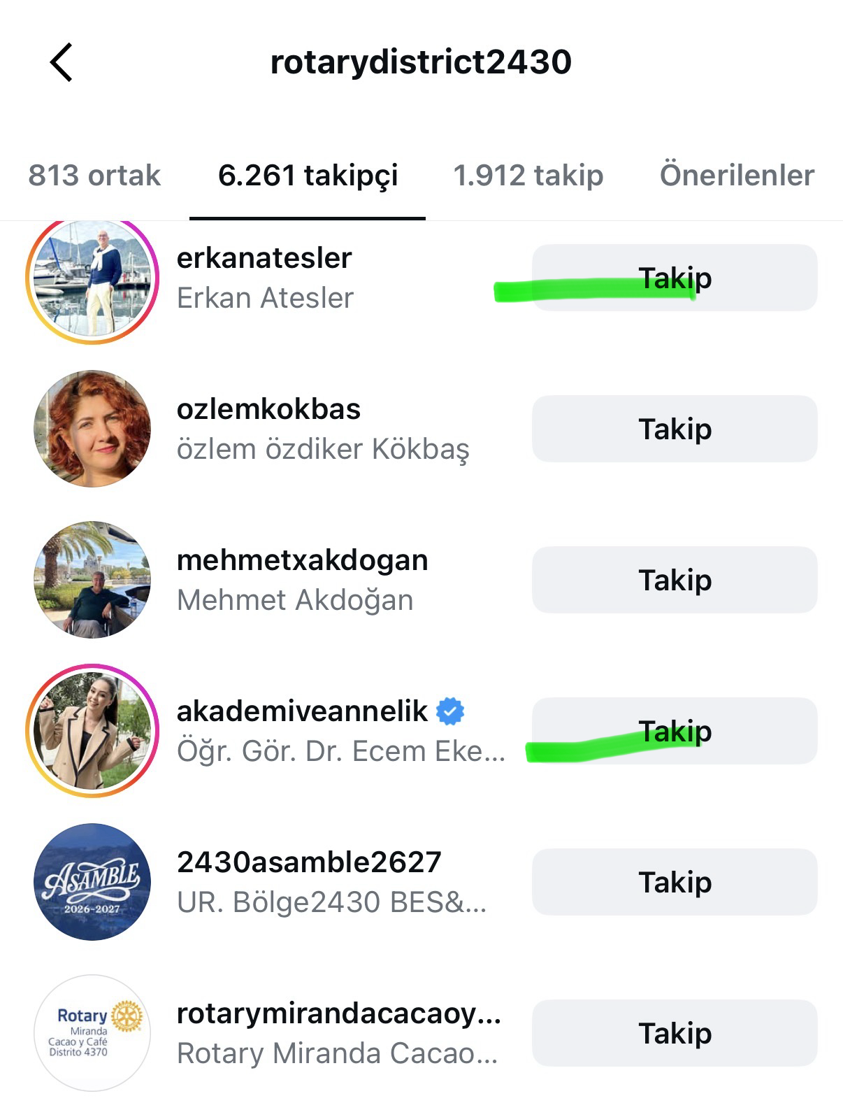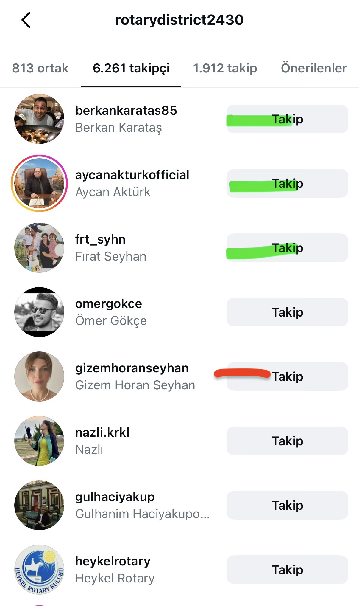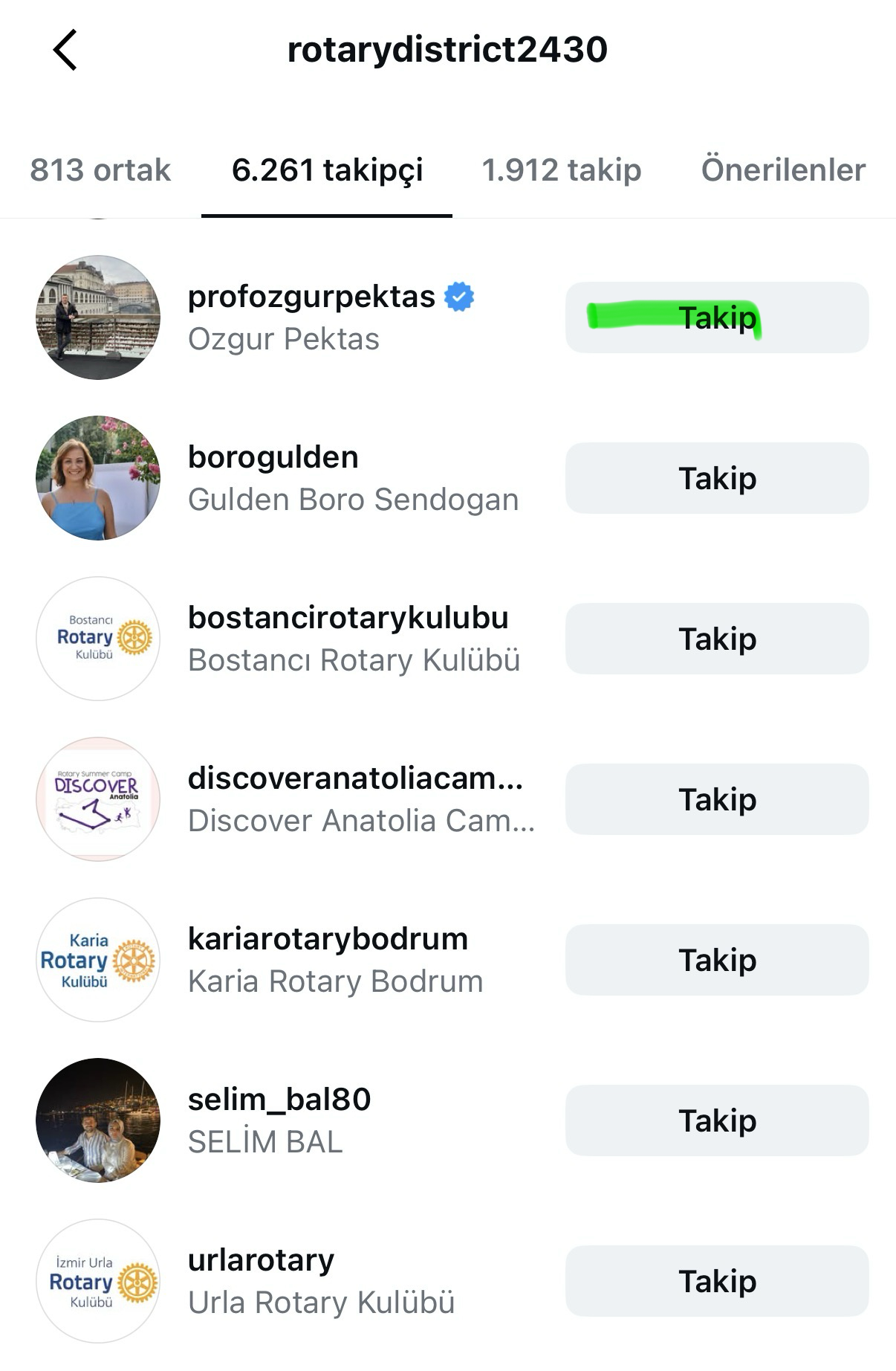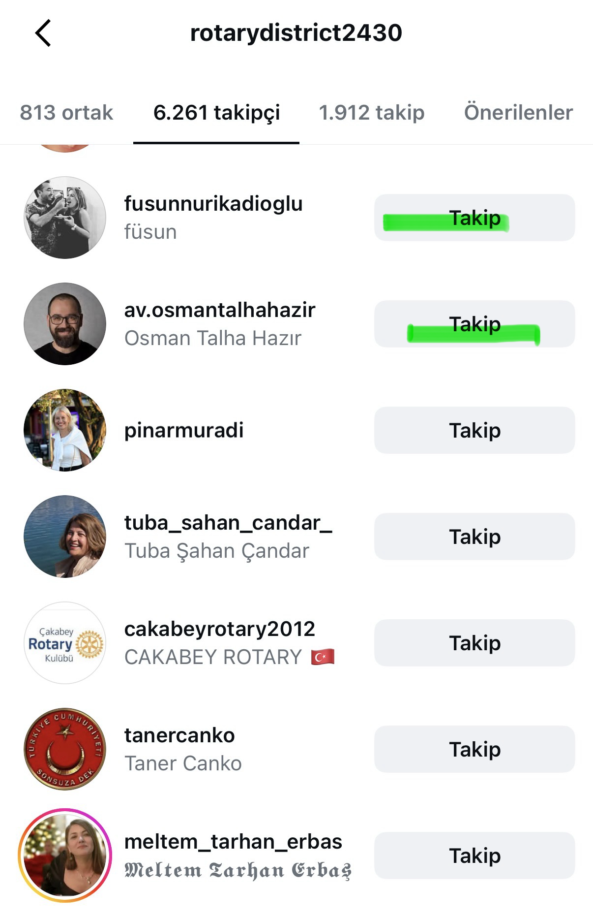 Adana Güney Rotary Kulübü Üye sayısı:59 Üye Takip Hesabı: 45 (yeşil işaretlidir) Eşler takip (kırmızı işaretlidir)