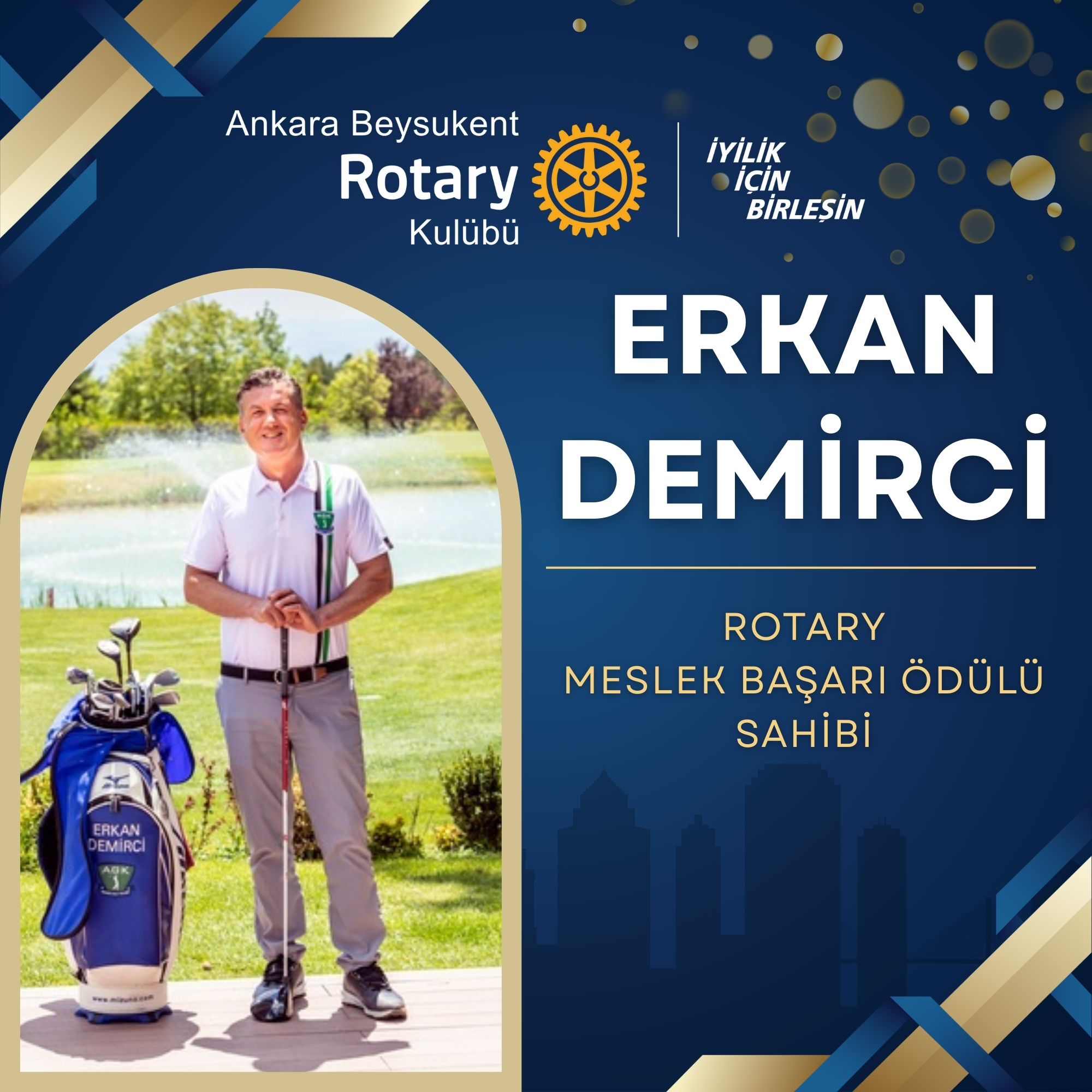 Rotary’nin temel taşlarından biri olan Meslek Hizmetleri; mesleğin bilgi, deneyim ve etik değerlerle toplum yararına sunulmasını esas alır. Ankara Beysukent Rotary Kulübü olarak, bu anlayışı benimseyen ve mesleğini ahlak, iyi niyet ve sorumluluk bilinciyle icra eden kişilerin ödüllendirilmesini önemsiyoruz. Bu kapsamda, Meslek Hizmetleri Komitemizin önerisi ve yönetim kurulumuzun kararıyla; mesleğindeki üstün başarısı, golf sporuna yıllar boyunca sunduğu katkılar, yetiştirdiği profesyonel sporcular ve golfü her kesime yayma vizyonu nedeniyle, Meslek Hizmetleri Ayı içerisinde, Ankara Golf Kulübü Direktör Head-Pro’su Sayın Erkan Demirci’ye Ankara Beysukent Rotaract Kulübü ile birlikte 05 Ocak 2026'da Meyra Palace'da yapılan Meslek Hizmetleri Ödül Töreni ile Rotary Meslek Başarı Ödülü verilmiştir. Ödül kendisine GDG. Murat Öz tarafından takdim edilmiştir.