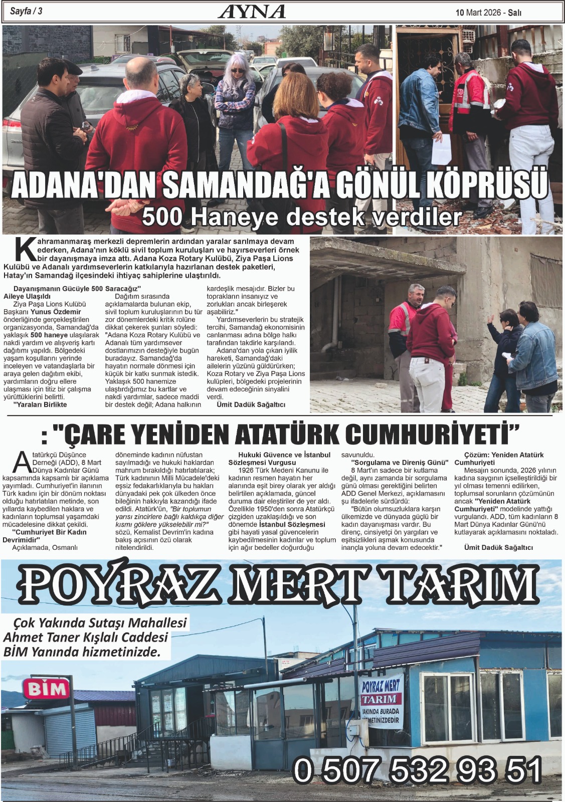 7 Mart 2026 Cumartesi günü Hatay’ın Samandağ ilçesinde depremzede vatandaşlarımıza destek olmak amacıyla topladığımız yardım SEVADER (Samandağ Eğitim Vefaa Anlayış Derneği) ve Ziyapaşa Lions Kulupleri işbiliğiyle gerçekleştirilmiştir.