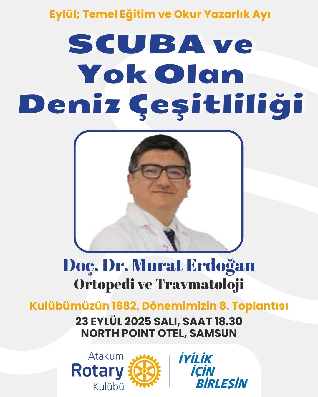 Doç Dr Murat Erdoğan, ortopedi ve travmatoloji alanında faaliyet göstermekle birlikte, dalış yapan ve deniz çeşitliliği konusunda toplumu bilgilendiren bir hocamız olup, konuşmacı konuk olarak kendisini toplantımıza davet ettik.