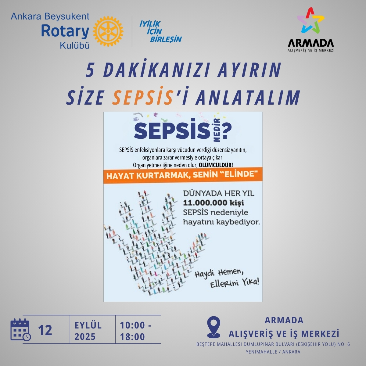 Ankara Beysukent Rotary Kulübü olarak, Sepsis Farkındalığı Komite Başkanımız İsmet Taner liderliğinde, Sepsis Farkındalık Günü sebebiyle 12 Eylül'de Armada AVM'nin en işlek alanında Sepsis Farkındalık standımızı açtık. "Bize 5 dakikanızı ayırın, size sepsisi anlatalım" diyerek yola çıktık ve gün boyunca birçok insana sepsisi, belirtilerini ve önlemek için neler yapılması gerektiğini üyelerimizle birlikte aktardık. Katılan tüm dostlarımıza teşekkür ederiz.