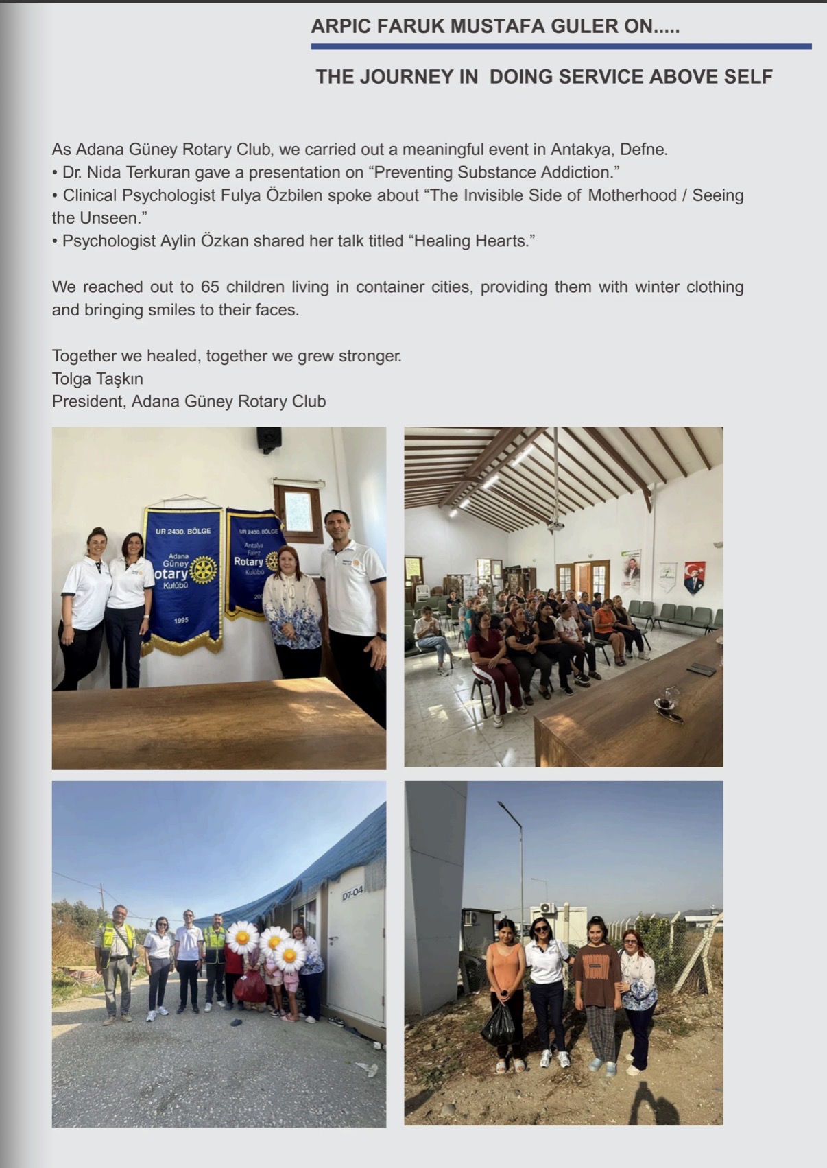 5- Adana Güney Rotary Kulübü olarak, Antakya Defne Gönüllüler Derneği ile Konteyner kentlerde kalan çocuklarımıza kışlık kıyafet ve okul çantası bağışında bulunduk.