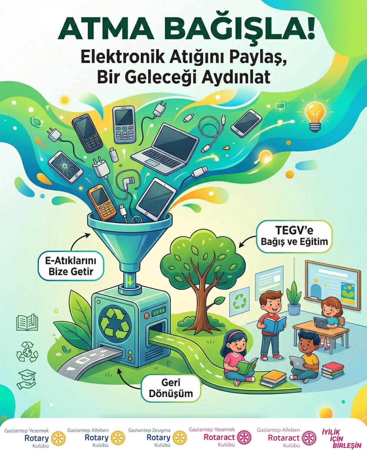 30 Mart - 9 Nisan arası elektronik atık niteliğindeki her ürünü toplayıp 10 Nisan günü Tegv kurumsal / kaynak geliştirme uzmanı Zeynep Gerçekoğlu vasıtasıyla teslim edeceğiz.