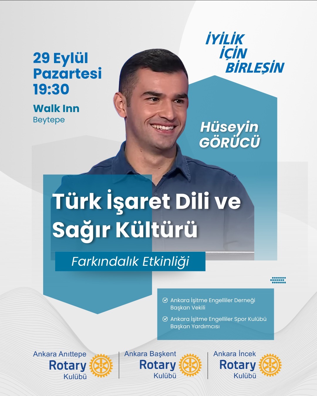 Ankara Başkent, Anıttepe ve İncek Rotary Kulüpleri olarak ortak olarak düzenlediğimiz toplantımızda Ankara İşitme Engelliler derneği başkan Vekili ve Ankara işitme Engelliler Spor Kulübü Başkan Yardımcısı Hüseyin Görücü'yü misafir ederek işitme engellerin sorunlarını paylaşarak bu konudaki farkındalığımızı artırmayı amaçladık.