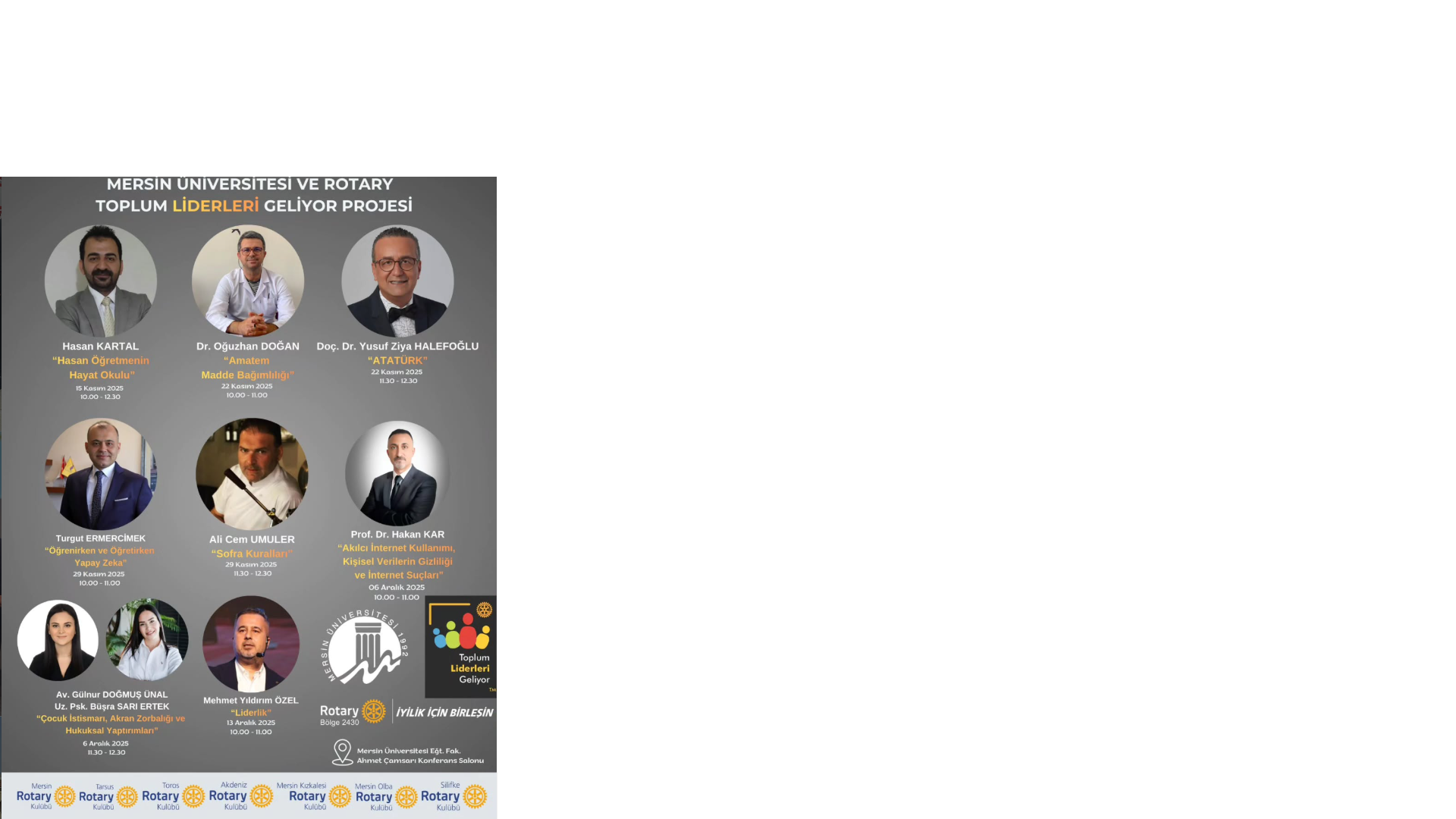 Mersin kulüpleri ile ortak olarak gerçekleştirdiğimiz Toplum Liderleri Geliyor projemizin 19. sunu düzenledik. Alanında uzman konuşmacı konuklarımızla 5 hafta boyunca yüksek katılımlı toplantılar yaptık. Program sonunda Mersin Üniversitesi Eğitim Fakültesi öğrencilerinden bütün toplantılara eksiksiz katılım sağlayan öğrencilere sertifikalarını verdik.