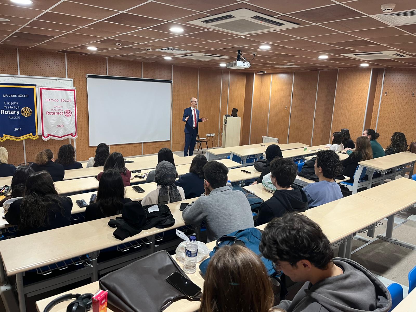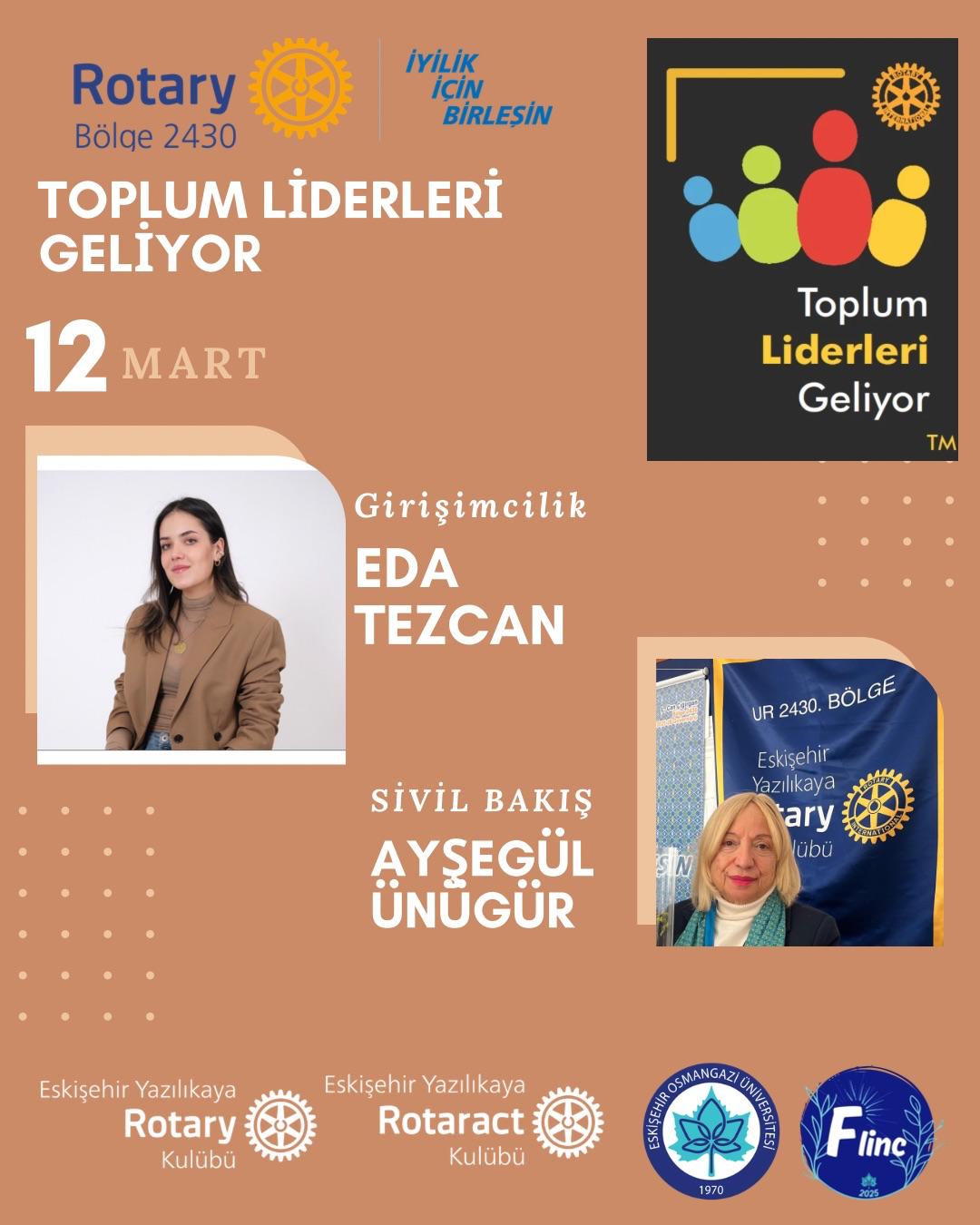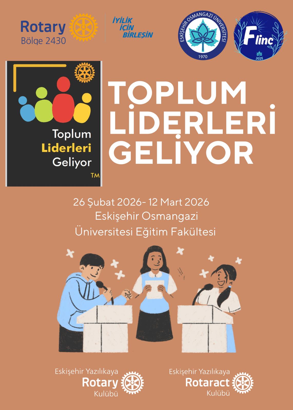 Kulübümüz, Eskişehir Yazılıkaya Rotaract Kulübü iş birliğiyle 26 Şubat -12 Mart tarihlerinde Eskişehir Osmangazi Üniversitesi Eğitim Fakültesi öğrencileriyle birlikte Toplum Liderleri Geliyor Projesini gerçekleştirmiştir. Proje kapsamında, alanında uzman profesyoneller ve yazarlar öğrencilerle buluşturularak; iletişim, liderlik, etik değerler ve toplumsal sorumluluk konularında farkındalık kazandırılması hedeflenmiştir. Programda, katılımcıların hem bireysel gelişimlerini desteklemeleri hem de topluma katkı sunabilecek bilinç ve donanıma ulaşmaları amaçlanmıştır. Proje resimleri, uzmanlar ve konularına ilişkin görseller ve etkinlik fotoğrafları bilginize sunulmuştur.