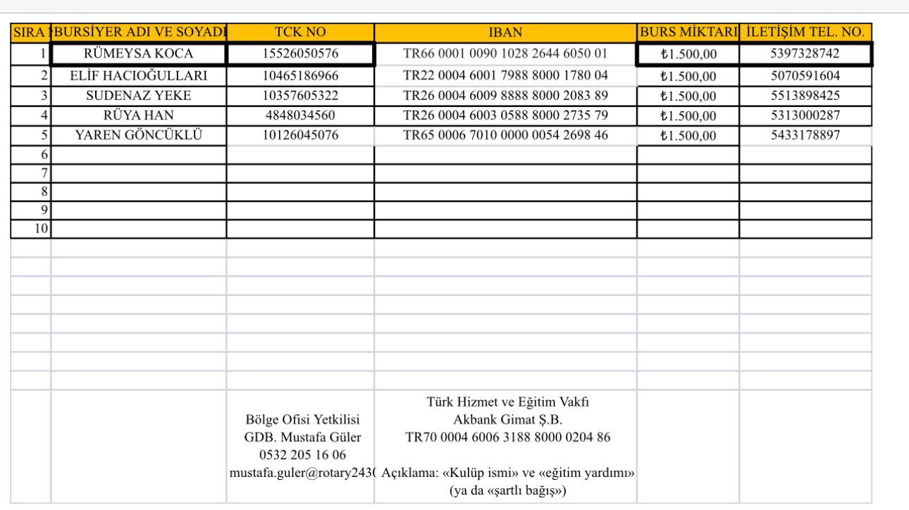 kulübümüz bursiyerleri için dönem boyunca burs verilmiştir. 1 kişi dönemde artırıldı toplam 6 kişiye burs verilmiştir kayıtları bölgede mevcuttur.